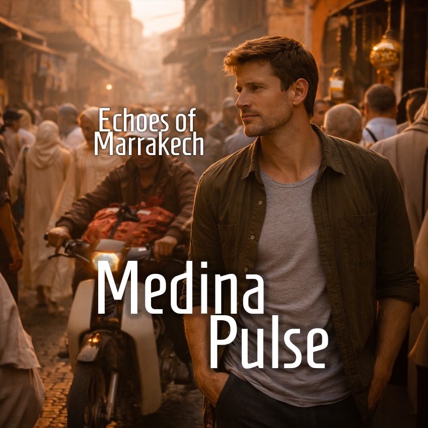 Cinematic progressive rock with gentle North African influence, flowing 6/8 groove around 90–94 BPM, Layered marketplace ambience: distant snake charmer flute, soft crowd murmur, subtle street movement and light motor hum, Warm frame drum and darbuka rhythm, organic and steady (not aggressive), Deep smooth bass groove, Clean electric guitar with expressive melodic phrasing and emotional mid-song solo featuring sustained bends and slight Middle Eastern tonal inflection, Male vocal calm, observant, immersive, slightly poetic, Dynamic mood shifts: reflective opening, fuller rhythmic middle section, emotional guitar solo, then gentle atmospheric ending, Production warm, spacious, textured, organic, no pop clichés, focus on atmosphere and color rather than intensity