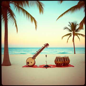 A live Indo-reggae festival performance — joyful fusion of sitar, tabla, dhol, and bamboo flute with reggae bass, off-beat guitar, and tropical percussion, Uplifting female vocals with mantric chants and crowd energy, Bright, rhythmic, and organic sound filled with sunshine, ocean breeze, and dancing spirit, Blend of Indian ragas and Caribbean rhythm, with warm analog tone and festival ambience — like Goa in May, full of color and life