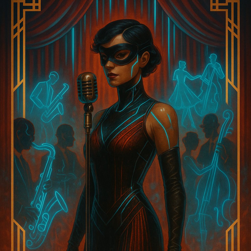 A high-energy fusion of jazz, swing, and electro starts with brassy synth stabs, punchy walking bass, and chopped swing drums at a brisk dancefloor bpm, Sassy female vocals deliver tight, syncopated phrasing before dissolving into a cyberpunk-inspired solo from a synthetic voice modulator, Instrumental breaks layer glitchy textures, fat brass samples, and urgent beats for futuristic club appeal