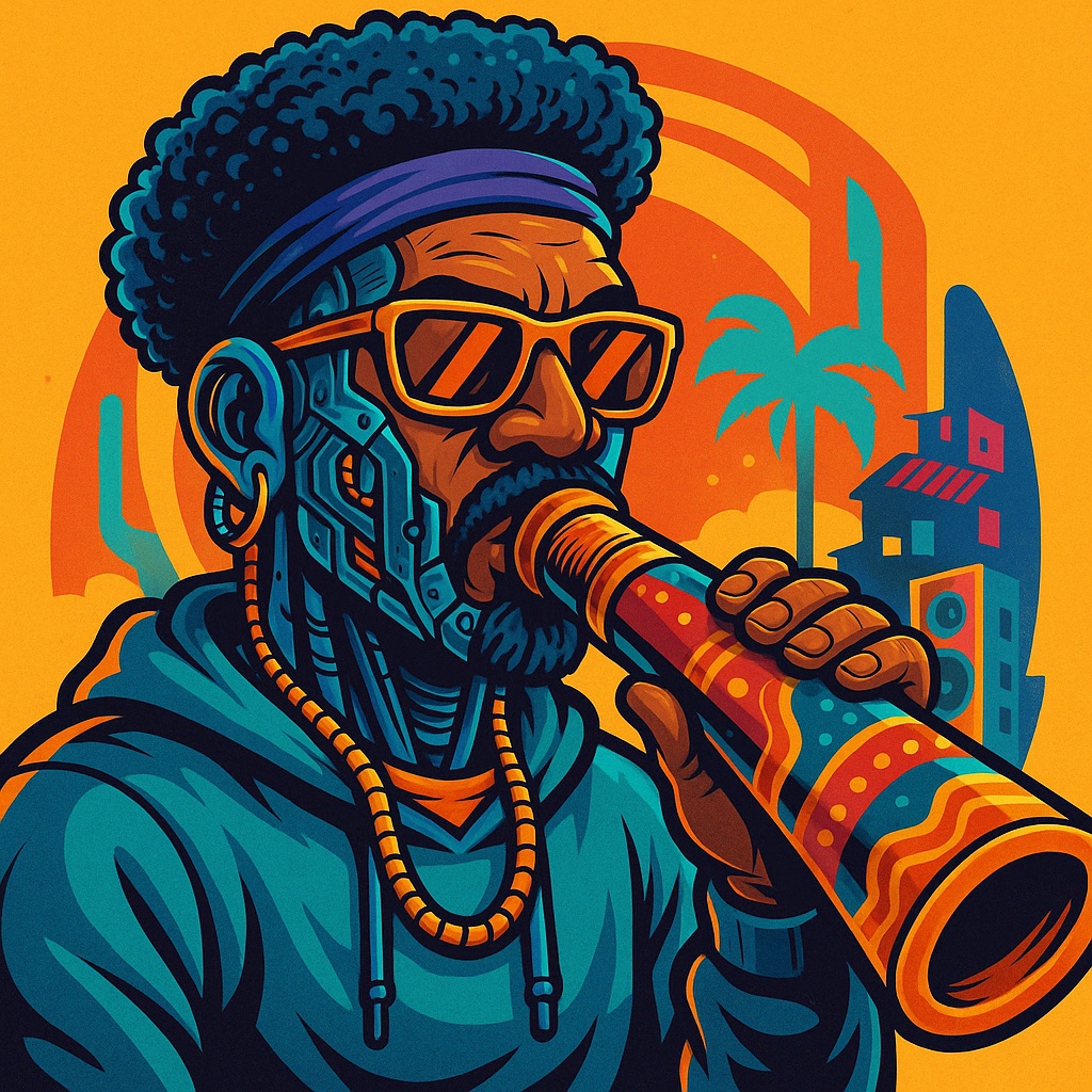 Brooding cinematic soundscape with dark 80s didgeridoo tones, synthpop arpeggios, metallic new wave drums, and deep growling post-punk bass, Analog synths with detuning and digital decay merge with eerie ambiences; jazz harmonies, subtle sax/keys add chill, polished sophistication, ‑Jazz Harmonies