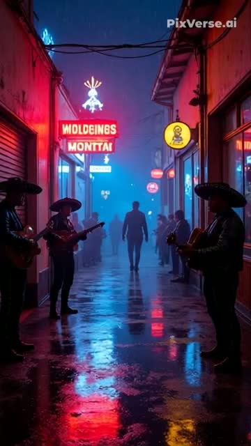 Mariachi + Cyberpunk Synth + Trap, cinematic film soundtrack, Spanish guitar riffs, mariachi trumpet lines, fast violin runs, deep 808 sub, crisp trap hats & snares, gritty bass synth, neon arpeggios, glitch FX, rain & thunder ambience, Verse: male rap-singing in Spanglish, confident, urban storytelling, Pre-chorus: female airy whispers, doubled, stereo echo, Chorus: male+female call&response, wide stereo, crowd chant FX, Breaks: glitchy trumpet echoes, distorted laughs, gun click samples, reversed guitar, Bridge: intense violin solo + sub-heavy trap beat, Final chorus: altered lyrics, huge mariachi horn section, cinematic pads, cyberpunk tension, Outro: fading guitar, thunder, soft “tormenta” whisper, Equal style balance, hooks, NLP-phrasing, strong rhymes, catchy & chart-ready, immersive, human emotional flow, hypnotic groove, memorable riffs, drop build-ups & cliffhanger moments