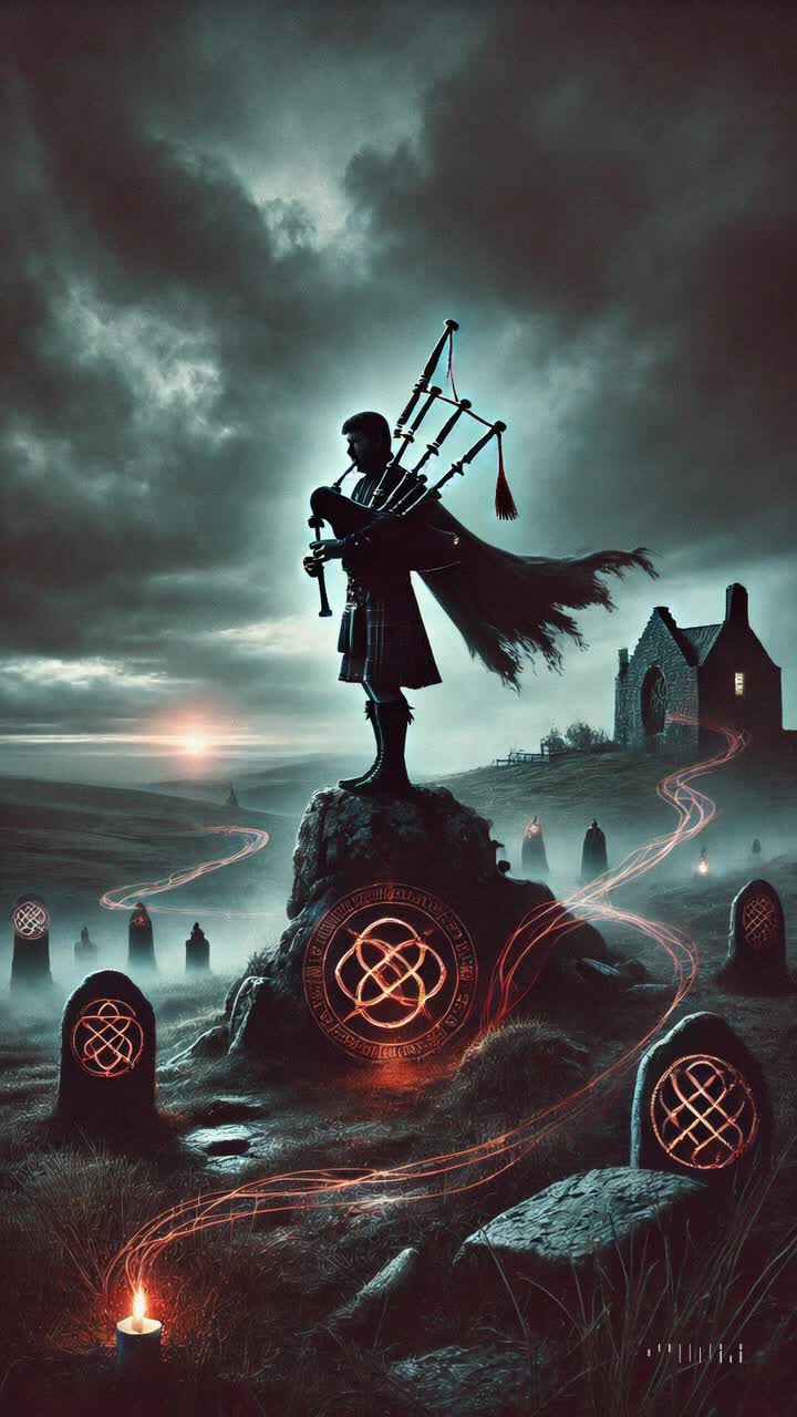 Dark country groove, banjo riffs, bagpipe swells, bagpipe bends, industrial drums, distorted basslines, glitchy textures, gritty vocals, echo effects, Gaelic whispers, metallic clangs, syncopated breaks, stomping kicks, twangy bends, ghostly reverb, NLP hooks, vocal growls, tribal percussion, tremolo banjo, fiery guitar drops, eerie pads, clangy impacts, vocal chops, breathy stabs, rusty textures, glitch breaks, epic buildups, cinematic transitions, whispered inserts, layered harmonies, ritualistic chants, male/female contrast, cliffhangers, reversed banjo, atmospheric drones, bagpipe drones, bagpipe screams, voice echoes, tension rises, choral backing, feedback screams, final drop