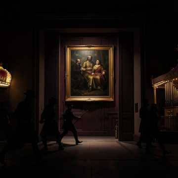 rock, Gothic symphonic metal with male vocals, harpsichord and piano intro blooming into detuned carnival organ, choirs, and palm‑muted guitars, Verses creep in a minor key waltz, brushed snares and bowed strings; chorus explodes to cinematic rock with double‑kick surges and soaring orchestral brass, Dark cabaret swing in the bridge with off‑kilter circus vibes, then a final towering crescendo with stacked choirs and a long, dramatic cut‑off, dark cabaret, gothic symphonic metal, emotional