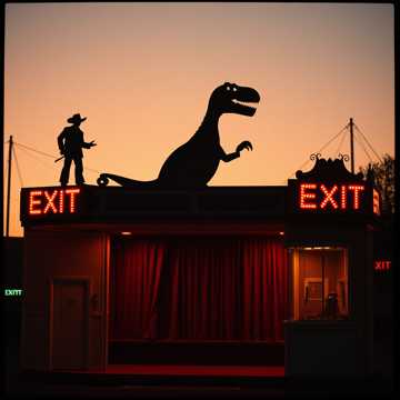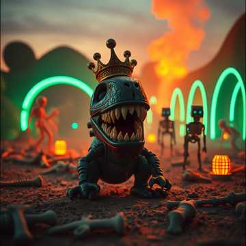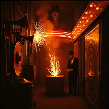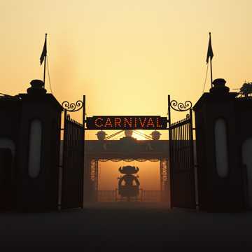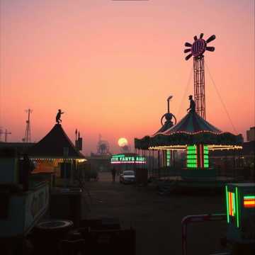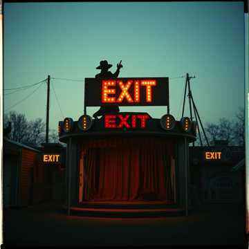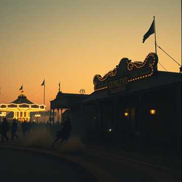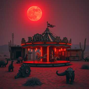 A 1950s theme park atmosphere emerges with bright brass, xylophone, and upright bass, Gradually, swirling calliope and twisted percussion overtake, then gritty guitars and harmonica bleed in, joined by horror-western strings, Tribal drums thunder beneath eerie samples, Electronic glitches disrupt with stuttering animatronic voices, climaxing in a chaotic choral finale where warped carnival themes and wild-west fragments spiral together
