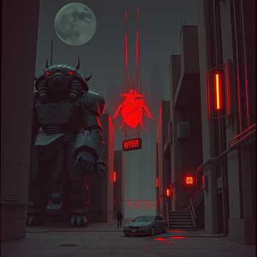 Industrial dark metal horror, biomechanical rhythms, grinding bass engines, metallic percussion, machine-heart pulses, distorted growls processed into inhuman textures, relentless mechanical dread