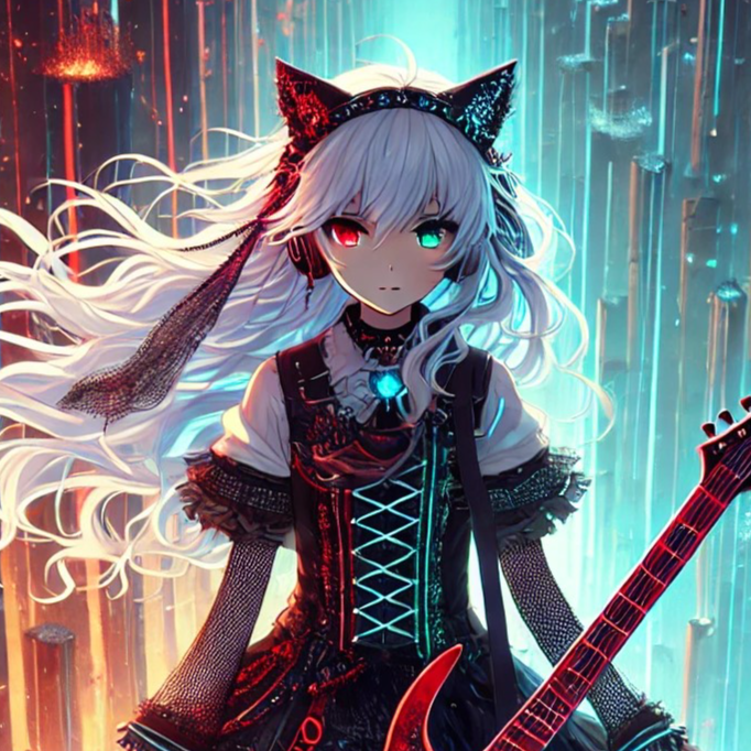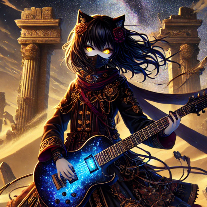 female vocal, Melodious, azteca, Cool Vocal, Fluent, Super tecnique Guiter, Anime, Cyber, heavy and atmospheric with dark cinematic depth, Tempo ~160–175 BPM, mid-fast with double-kick drives, Down-tuned guitars deliver syncopated chug riffs layered with glitchy effects and dissonant harmonics, Bass thick and distorted with sub-drops, drums sharp, Electronics add glitch layers, distorted synths, cyber pads, and processed choirs; low strings and metallic hits underline ritual gravity, Arrangement: glitch/ambient intro → syncopated riff verses → sparse distorted fragments → choruses with layered riffs and melodic synth pads → bridge with polyrhythmic chugs and stutters → final chorus full-layered intensity, Mixing emphasizes massive low-end, wide guitars