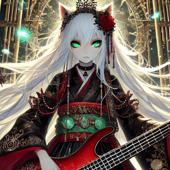 female vocal, Dark, heavy anime-song with gothic rock and mythological tones, blending Japanese traditional sounds with melodic power metal, Tempo around 152 BPM, fast and driving with double-kick drums for urgency, Distorted twin-lead guitars with tremolo and gallop riffs, resonant bass, aggressive drums, Noh flute, biwa, shamisen, and taiko add a ritual atmosphere, Orchestral strings and low brass enhance grandeur, Intro starts with eerie flute and biwa before crashing into full band, Verses tense and minimal, pre-chorus lifts with strings, chorus soaring and melodic, Last chorus modulates up with layered choir and strings, Outro fades into distant flute and taiko heartbeat, Vocals are powerful and dramatic with chant-like backing harmonies, shifting from tense verses to soaring climaxes, Mixing emphasizes heavy low-end, wide guitars, reverb vocals, subtle Japanese layers, choir and strings spread for epic scale