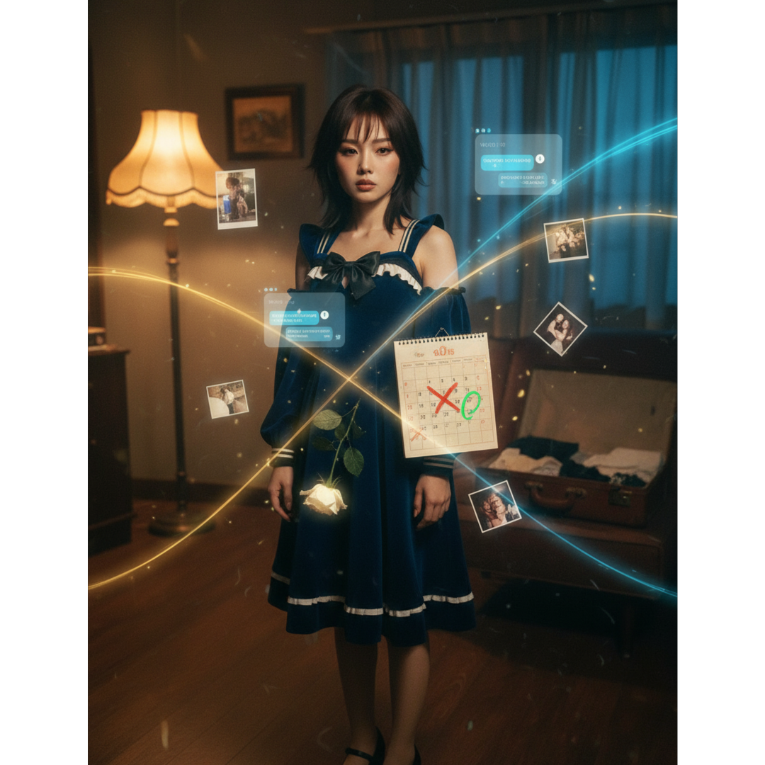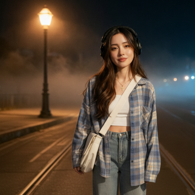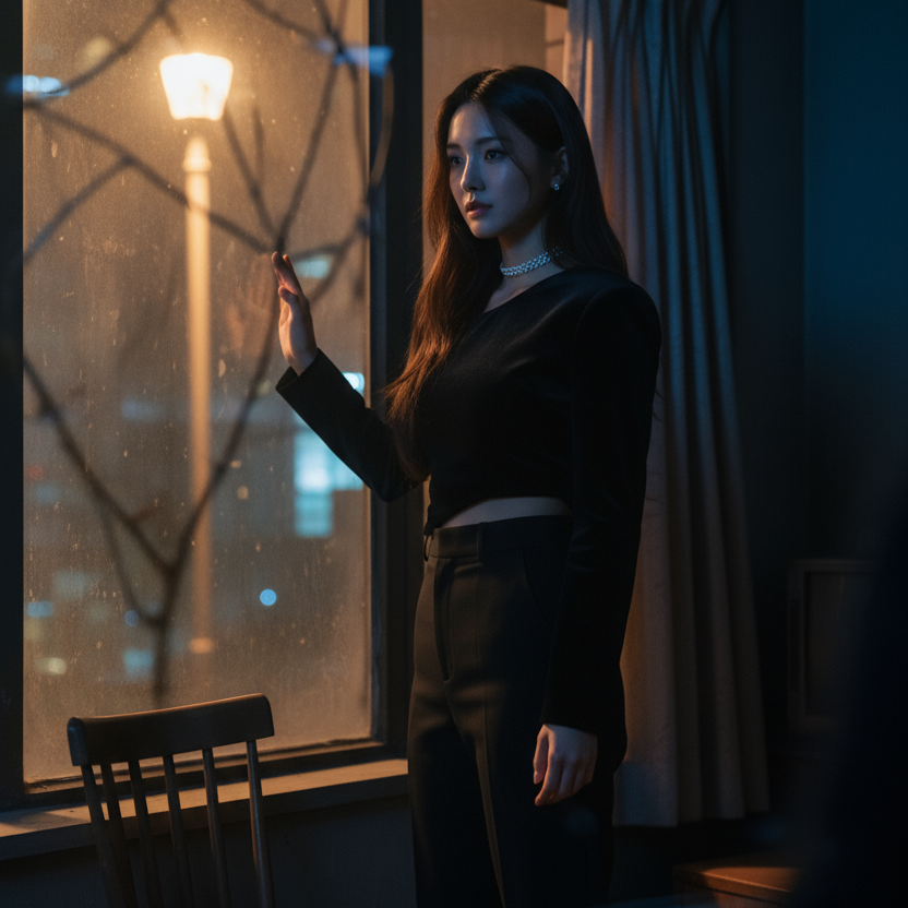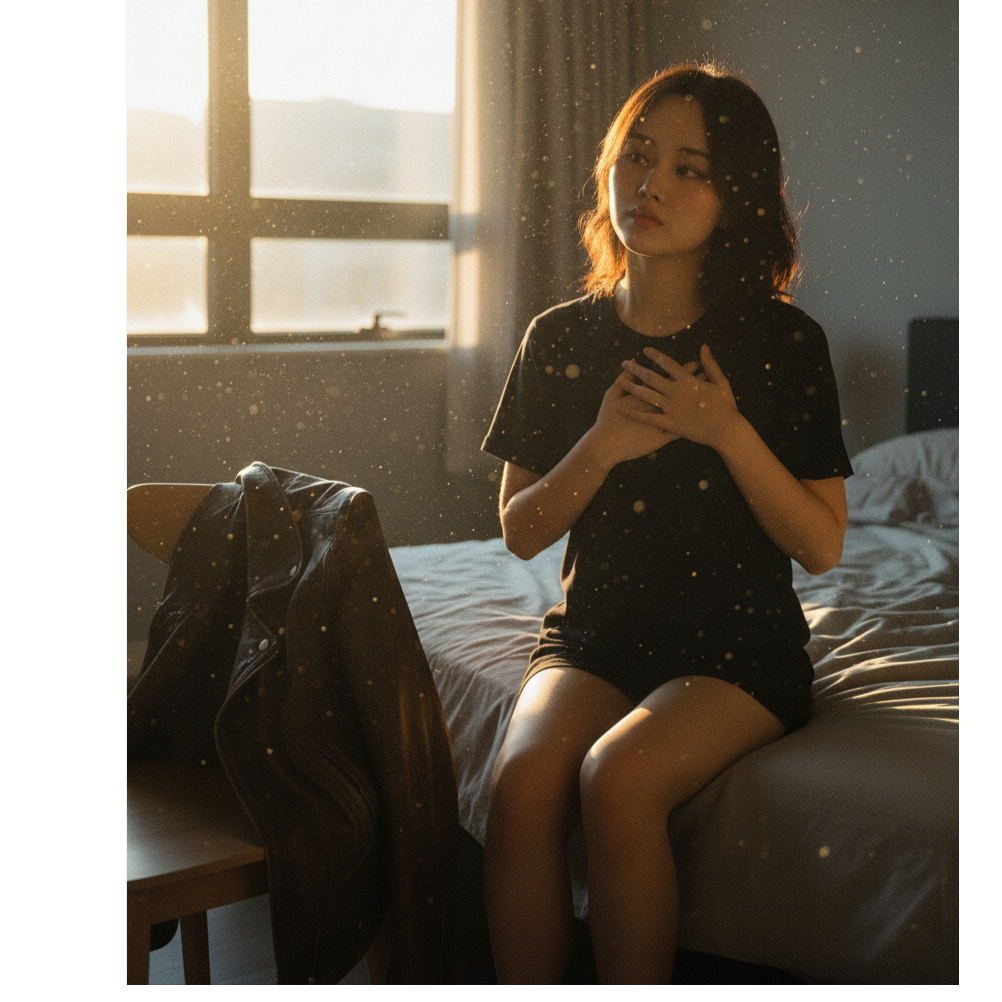 This Alt K-pop dreamscape pulses at 110-118 BPM in F♯ minor, led by soft acoustic guitar plucks and lo-fi rim taps over organic sub-bass, Ambient textures—chair creaks, stairwell echoes, and window hum—populate the lived-in mix, Whispered vocals blend airy leads, playful doubles, and low murmurs, with journal-like, fragmented phrasing, unfiltered stutters, falsetto cracks, and abrupt cutoffs, all amplifying the raw, intimate texture