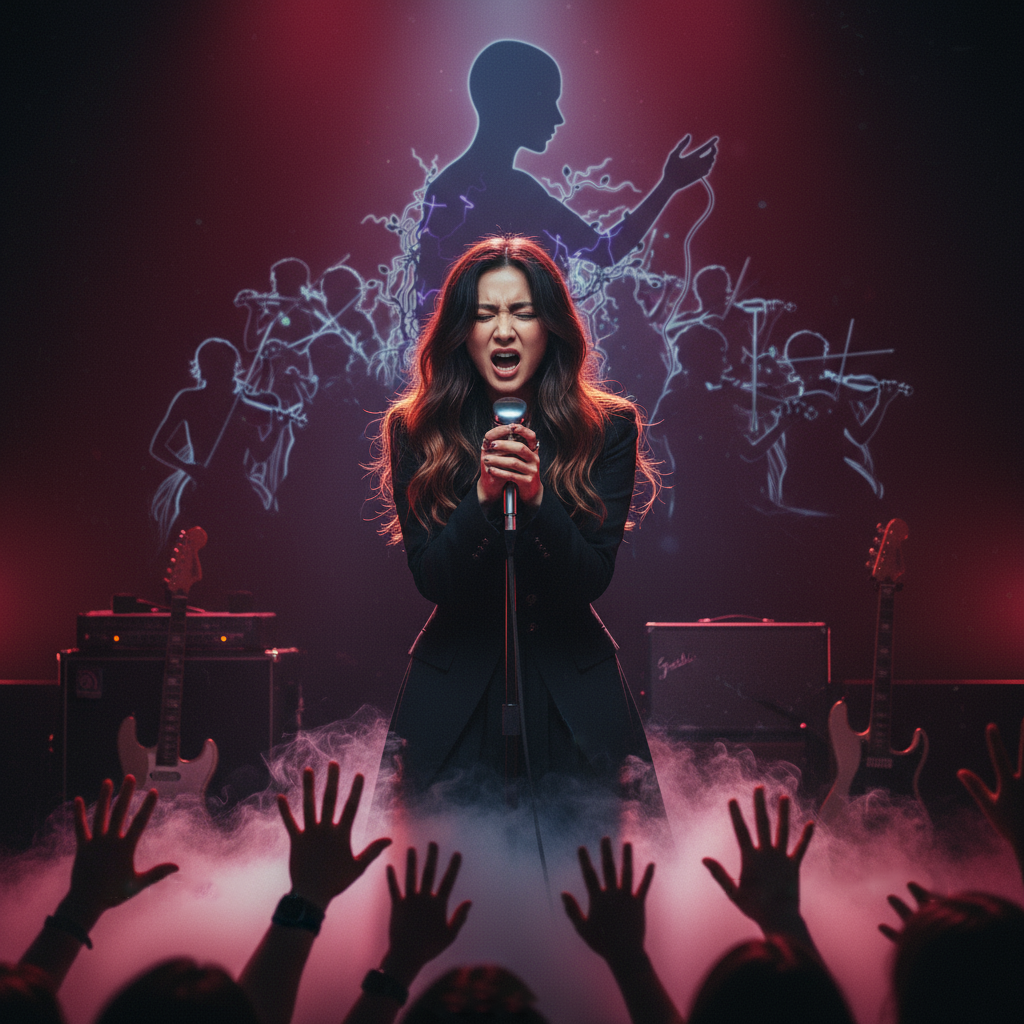 K-Rock symphonic anthem in F♯ minor at 115–130 BPM, driven by distorted guitar riffs and thunderous live drums locking tight with a growling bass foundation, Cinematic strings and shimmering synth pads weave beneath, adding drama and grandeur, Raw feedback swells and cymbal crashes inject urgency, while whispered fragments and chant gang vocals cut through the wall of sound, Vocals shift from airy, restrained confessionals in the verses to soaring, anthemic belts in the choruses, supported by layered harmonies, falsetto ad libs, and shouted responses, Journal-like, bilingual phrasing mixes vulnerable intimacy with explosive catharsis, amplified by stutters, screams, and abrupt cutoffs that leave space for riffs and choreography-driven breaks — channeling both theatricality and raw edge in equal measure, ‑-compression, ‑-distortion, ‑-muddy vocals, ‑-noise, ‑-harsh noise, ‑-background noise, ‑-bad instrument, ‑-voice distortion, ‑-low quality, ‑-shimmer, ‑-clipping