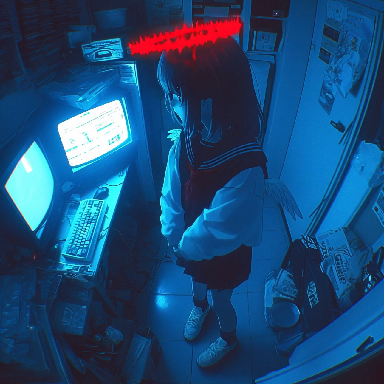 [Glitchcore, Dark Ambient, Digital Hardcore, Noise, Industrial, Experimental, Vocaloid, Glitch effect, Pitch warping, Bitcrush, Reverb, Whispered voice, Robotic tone, System error sound, BIOS beep, Static noise, Typing FX, Null, 404, Exit code, System freeze, Text-to-speech tone, Broken melody, Unexpected BPM drop, Disjointed lyrics, Code fragment, CRT flicker, Filter sweep, Left-right panning, Echo, Clipping, Fragmented memory, Emotional disconnection], ‑Tropical House, ‑Cute Pop, ‑Idol Vocal Tuning, ‑Major key progression, ‑Generic love lyrics, ‑“Forever love you”, ‑Bright melody, ‑Kawaii-style tone, ‑Clean mixing only, ‑Predictable pop structure, ‑Uplifting chorus, ‑Happy ending, ‑Too much cuteness, ‑Anime sparkle FX, ‑Full autotune polish, ‑Overused pitch correction, ‑High saturation visuals