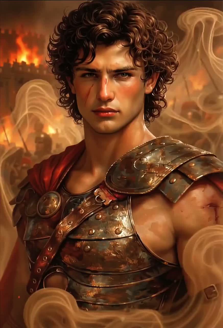A Pagan Metal, Greek Metal, Greek Folk, Ritual Metal, Doom elements Song about Patroklos told from Patroklos’ first-person perspective, Vocals should be male beautiful, warm, clean, emotional, mournful, expressive, Frame drums, War drums slow, heavy, ceremonial, Deep toms, tribal percussion Minimal blast beats only in battle sections, Ancient Greek lyra central melodic role, Bowed lyra, rebec, Low drones hurdy-gurdy–like texture, Subtle violin for lament sections, Downtuned electric guitars, Clean, reverb-heavy guitars for romantic/intimate verse, Slow, crushing riffs for chorus and battle sections, Deep, droning bass, Sustained notes supporting ritual atmosphere, Mood & Theme : tragic, intimate, Passionate, romantic, ritualistic, emotional, epic, ancient, mythological