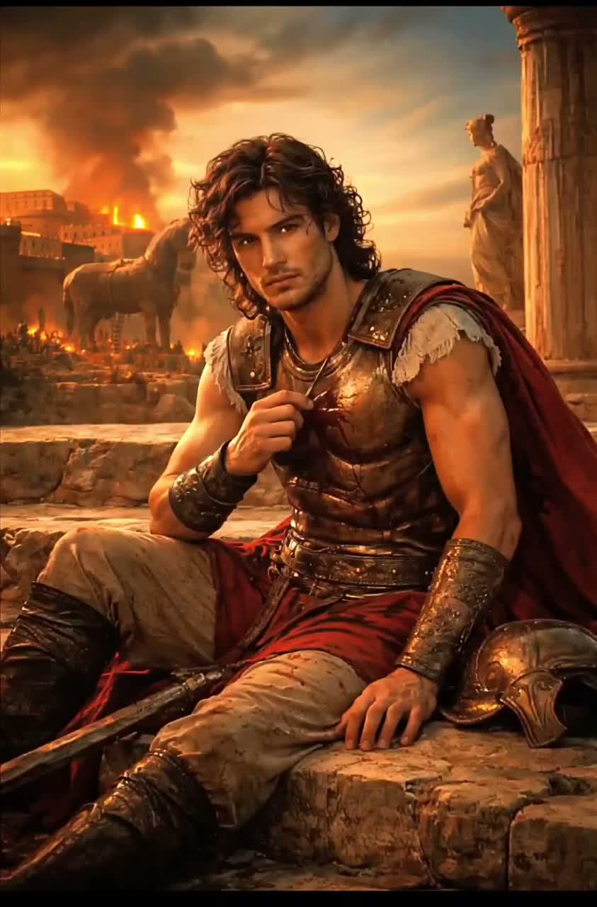 A Pagan Metal, Greek Metal, Ritual Folk Metal, Cinematic Ritual Metal Song About Paris of Troy, Fate Moira, forbidden love with Helena, guilt and desire, Vocals should be Male deep, beautiful and emotional, slightly raspy, dramatic storytelling tone, Occasional whispered lines, Epic male ritual choir, Alt-Greek sections, ancient, solemn, ceremonial, Heavy distorted electric guitars low-tuned, slow epic riffs, Frame drums, taiko-style war drums, deep tribal, percussion, Lyra / ancient Greek lyre, Aulos or breathy ancient flute, Low cinematic strings, Subtle drones and ritual ambience, Occasional acoustic folk break, Mood & Theme : tragic, mythological, epic, intimate, fate-driven, sensual but dark, ritualistic, cinematic, Apollo guiding Paris’ arrow to kill Achilles, Love versus destiny, Mythic tragedy, Epic pagan ritual metal, ancient Greek atmosphere, cinematic war tragedy, sacred folk metal