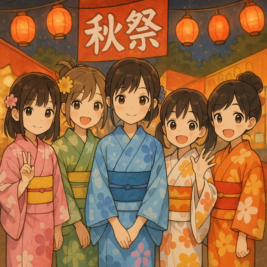 Japanese Idol Enka, summer matsuri atmosphere, traditional enka vocals with modern idol pop touch, shamisen and taiko with bright synths, festival cheers, nostalgic yet cute vibe, like Hibari Misora meets modern kawaii idol female idol vocals (5 voices), sweet and clear, Catchphrases like "おつかれざんしょ" are central to the hook