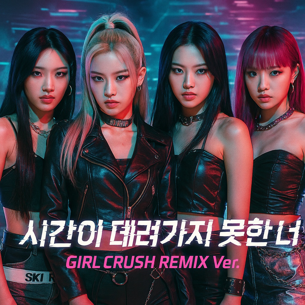 HI-res, Futuristic K-pop girl crush mixpop track blending cinematic trap, electro-pop, and glitchcore, Tempo ~122 BPM, Korean verses paired with chant-like English choruses, Features vocoder-stacked female vocals, metallic drums, sharp digital plucks, ambient risers, and glitch-style FX transitions, Vocal delivery fuses rhythmic rap phrasing with melodic attitude, Song structure includes an ambient glitch intro, intense Korean rap verses, tension-building pre-chorus, explosive English chorus hooks, a dramatic trap-inspired bridge, and a whispered ghostly outro, The lyrical theme centers on memory that time can't erase, turning grief into strength, Visual concept evokes post-cyberpunk glam: fragmented lights, glitch overlays, and neon metallic styling