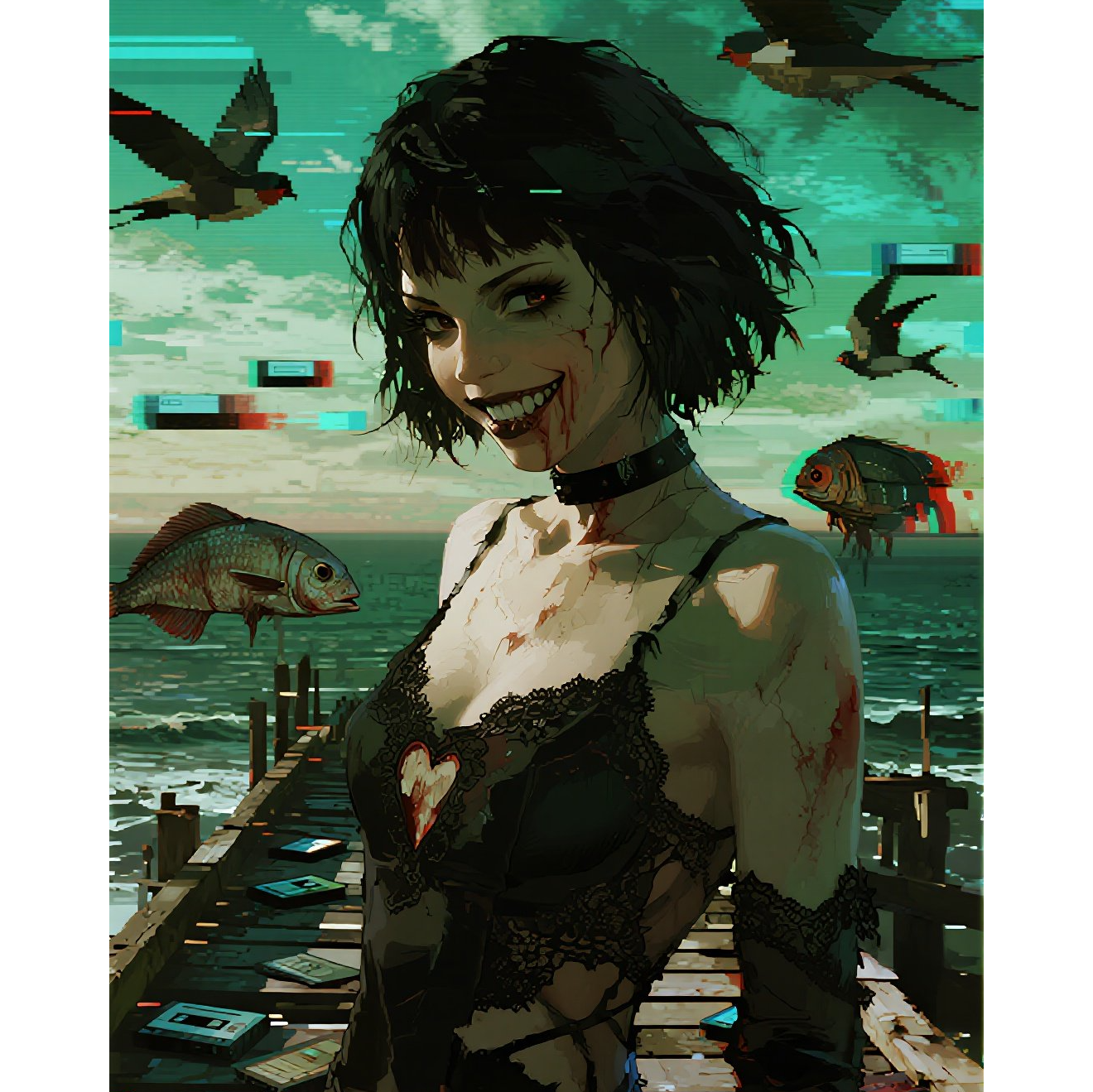 Dirty, reverb-heavy guitars slice through a tight post-punk groove with syncopated bass and abrasive drums, Angular synth textures pulse underneath, while female vocals alternate between melodic phrasing and urgent spoken-word, Effects-laden breakdowns add surreal layers before erupting back into driving, chaotic choruses, Start eerie and claustrophobic: low drone, metallic wing-synth, distant processed seagull samples, Verses: whispered/half-spoken vocal, sparse industrial clicks, gritty bass, Pre-chorus: build with syncopated toms and rising synth noise, Chorus: full Vera Choke blowout - overloaded guitars, pounding industrial drums, shrieks, gang-vocals and layered reverb, Bridge: megaphone spoken rant into glitch collapse, Final chorus: maximal wall of sound, then abrupt cut to a single decaying wing-synth and whispered outro