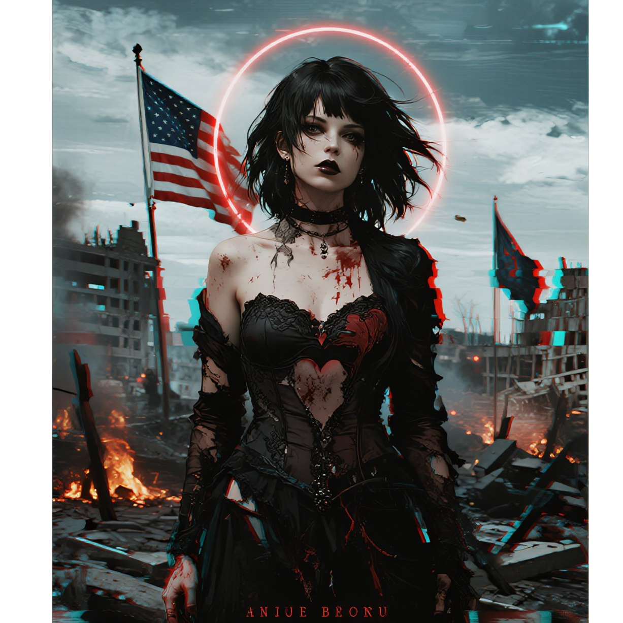 Dirty, reverb-heavy guitars slice through a tight post-punk groove with syncopated bass and abrasive drums, Angular synth textures pulse underneath, while female vocals alternate between melodic phrasing and urgent spoken-word, Effects-laden breakdowns add surreal layers before erupting back into driving, chaotic choruses, Intro: low drone + VHS tape hiss + whispered vocals with heavy distortion, Verses: angular post-punk bassline + clattering industrial percussion + jittery, detuned guitar stabs, Pre-Chorus: rising wall of metallic noise, background gang-chanting, Chorus: explosive - harsh guitars, pounding kick/snare, screaming vox layered with echo, chaotic synth stabs, Bridge/Breakdown: tempo drop, glitchy samples (tape rewinds, fake sword clangs), megaphone vocals, Final Chorus: everything maxed out, feedback, distortion, collapsing into silence and static