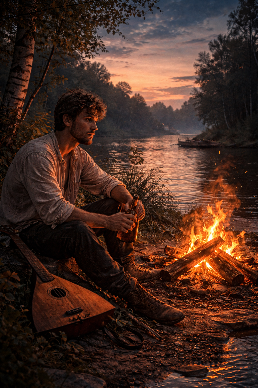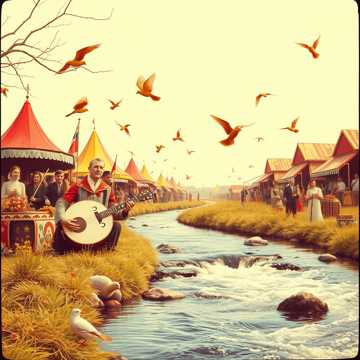 Русская народная песня с балалайкой, скрипкой, флейтой и барабаном, Мужской и женский вокал, Эмоциональная атмосфера деревни у реки, звуки природы, инструментальное вступление и окончание, Стиль: Отава Ё, меланхолично и радостно одновременно