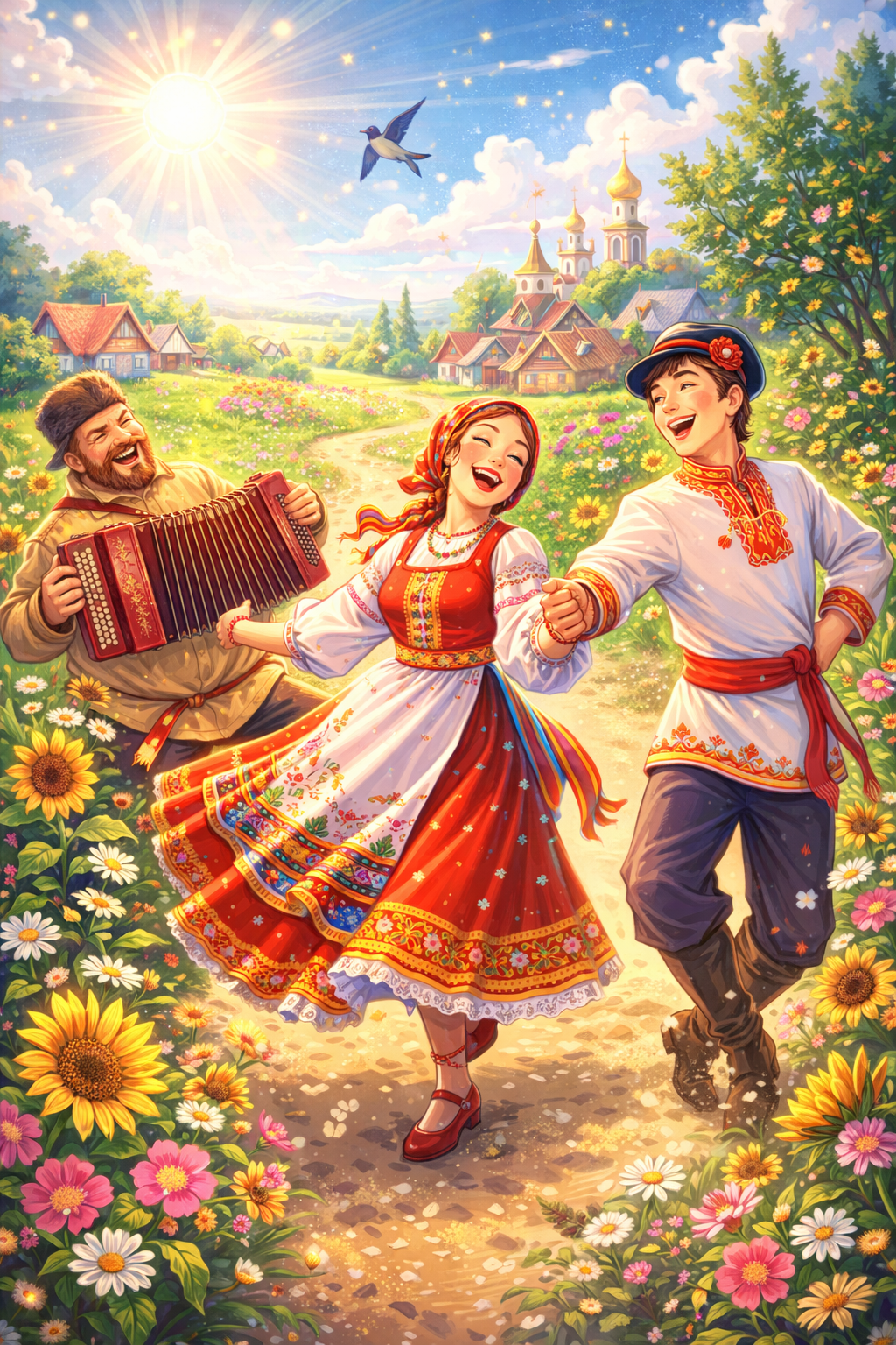 Energetic Slavic folk song with male and female vocals, balalaika, accordion, tambourine and violin, Use phonetic Russian lyrics with words like ‘lyu, da, ha, moya, solntse’, Fast tempo, humorous and lively, village dance atmosphere-style rhythm (tempo ≈ 105 BPM)