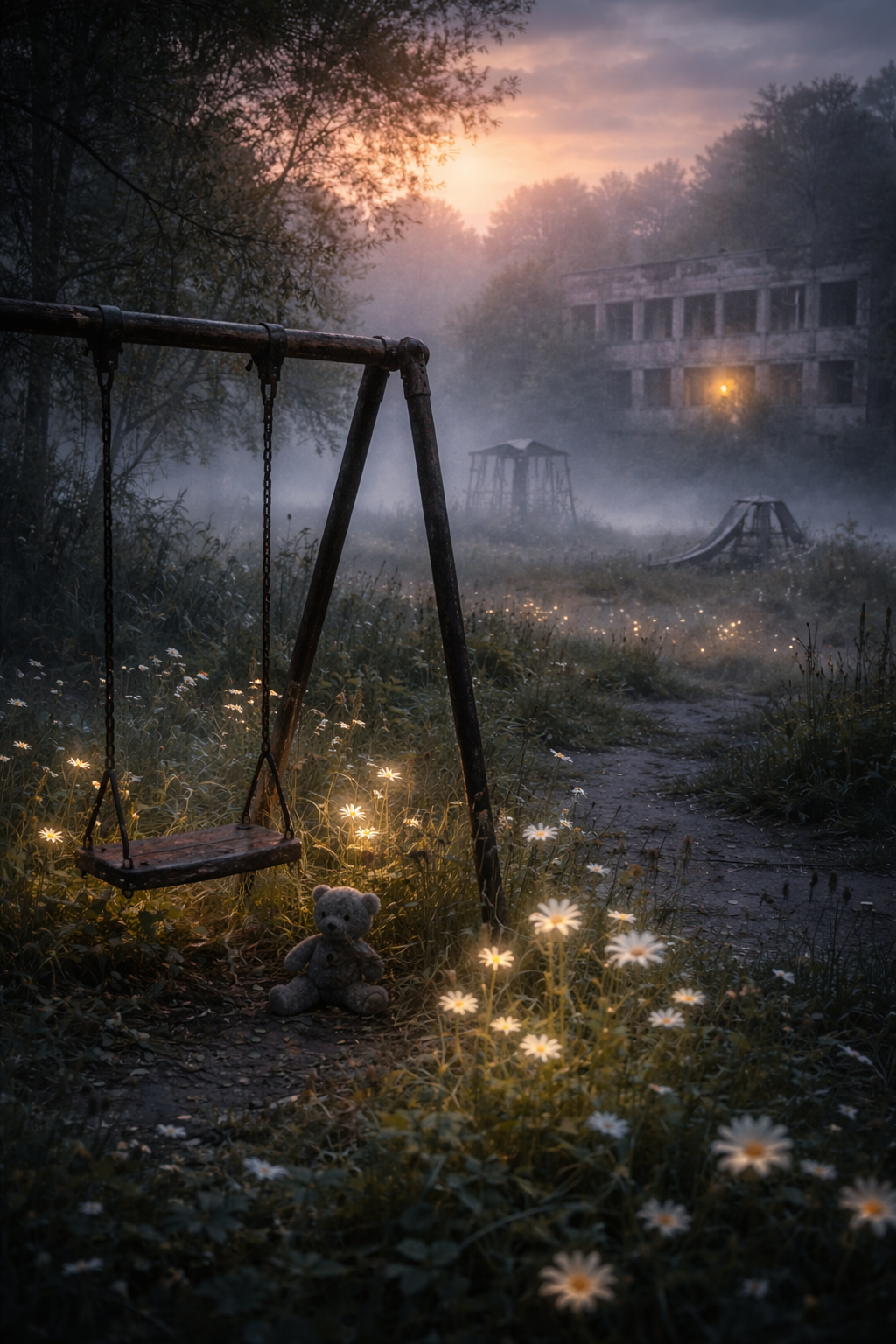 A soft Russian lullaby with folk elements and ambient synth layers, titled "Песнь детей Припяти" (Lied der Kinder von Pripyat), Emotional, nostalgic and deeply moving, the melody floats with gentle piano, female lead vocals, echoing harmonies, subtle balalaika tones, and children's choir in the background, Style evokes post-Soviet melancholia, soft night wind, and the spirit of forgotten places, Tempo: slow (around 75 bpm), Mood: Sad but beautiful, Instruments: Piano, ambient synths, balalaika, soft female vocals, children's chorus, distant bells, Sung in Russian