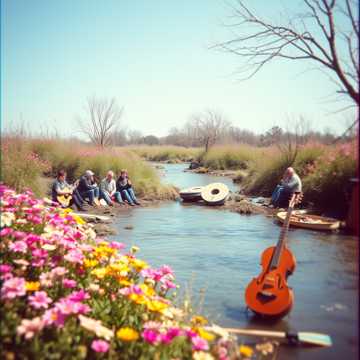 A lively, upbeat Russian folk song with balalaika, accordion, and group vocals, The melody should feel like a joyful celebration of life, dancing by the river in the spring sun, with lyrics about love, friendship, and the beauty of the Russian countryside, The chorus should be catchy and easy to sing along