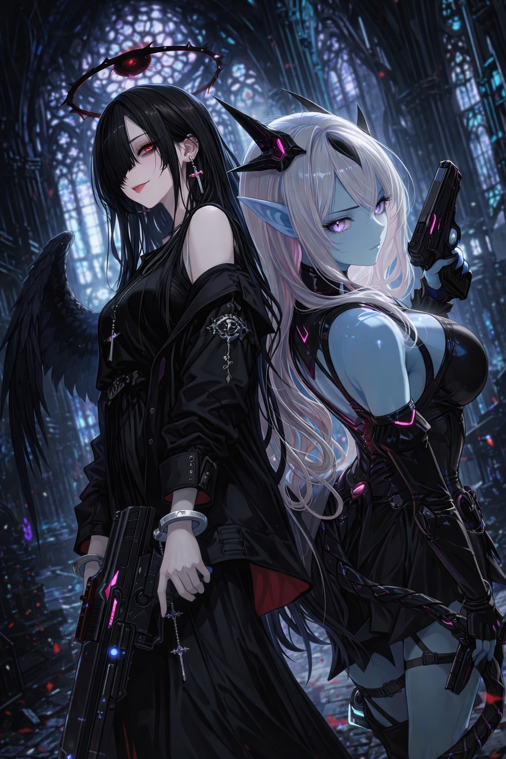 Gothic Rock × Electro Rock, Dark Atmosphere, Cyberpunk Ruins, Heavy Guitar Riff, Industrial Drums, Choir Accent, Epic & Emotional