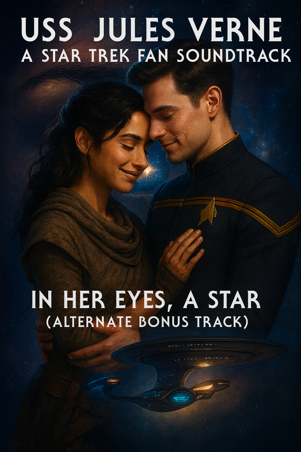 Romantic orchestral score in the style of early-90s Star Trek TNG emotional themes, Soft and intimate, avoiding epic elements, No choirs, no heavy percussion, no heroic builds, Focus on warm strings, gentle woodwinds, light harp accents, and soft solo flute or oboe, Melodies should be tender, nostalgic, slightly melancholic, with slow emotional swells, Atmosphere stays subtle and reflective, like a quiet personal moment on the Enterprise, No drums, no brass fanfares, no big crescendos — only calm, heartfelt orchestral storytelling, ‑choir