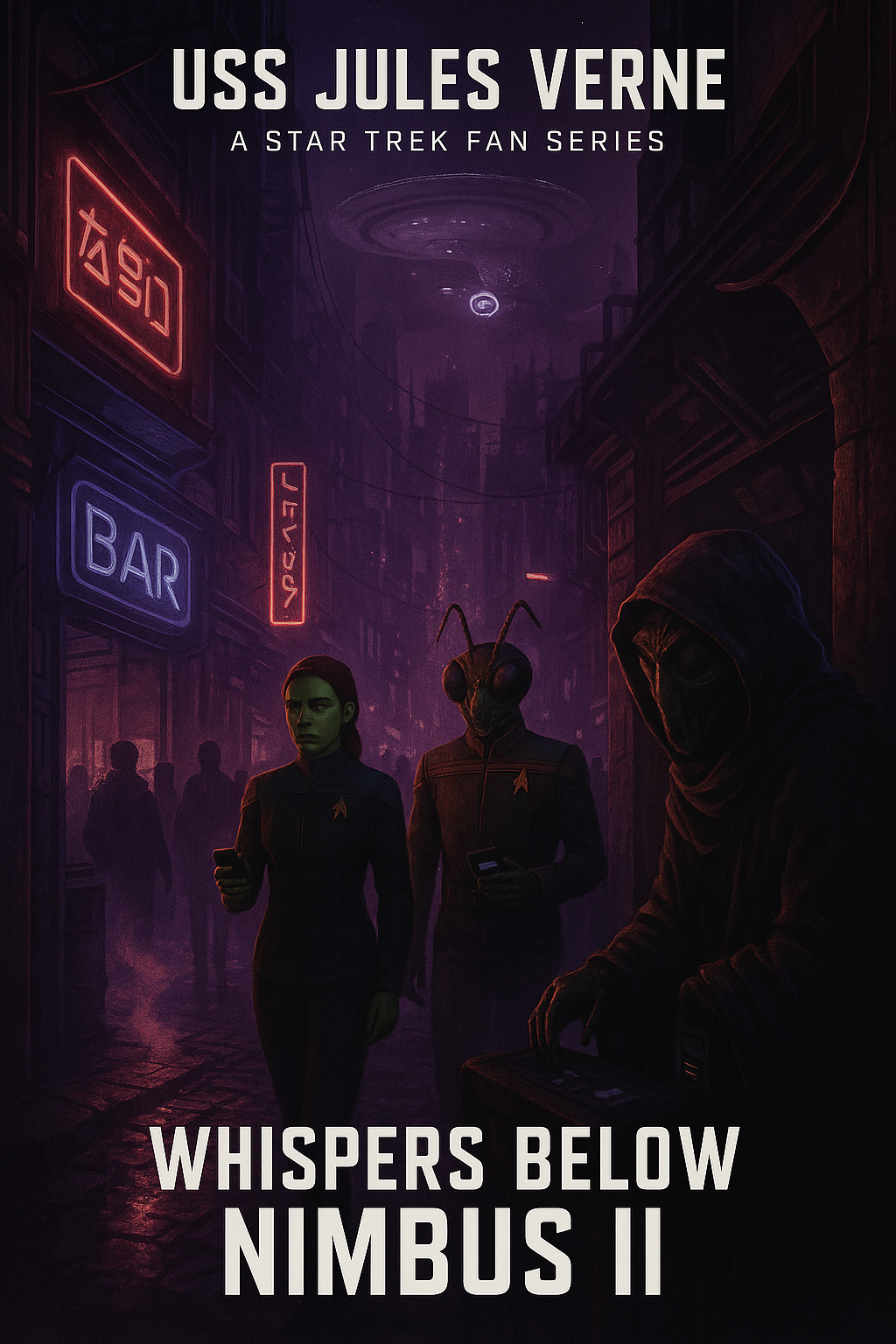 Espionage-style track blending orchestral and noir sci-fi tones, Bass clarinet leads with subtle pizzicato strings, ambient synth pulses, vibraphone textures, and hand percussion (congas, shakers), 78 BPM, Suspenseful and secretive, Inspired by urban spying on Nimbus III, hidden meetings, and underground deals, Minimal melody, moody groove, TNG-style mystery tension