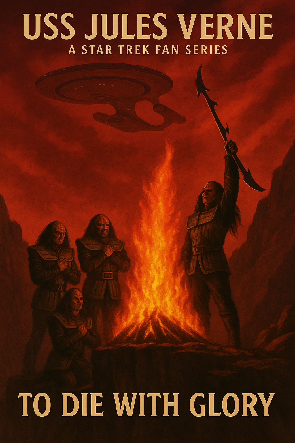 Epic Klingon-style funeral march with orchestral grandeur, Brass-driven with powerful horns and tuba, steady snare, taiko drums, cello, male choir (wordless), and cymbal crashes, Prideful, martial, and solemn, Inspired by Klingon traditions of honor and sacrifice, Slow tempo, structured like a ceremonial procession, Emotional but noble, with a final salute in music, Star Trek TNG-style orchestration