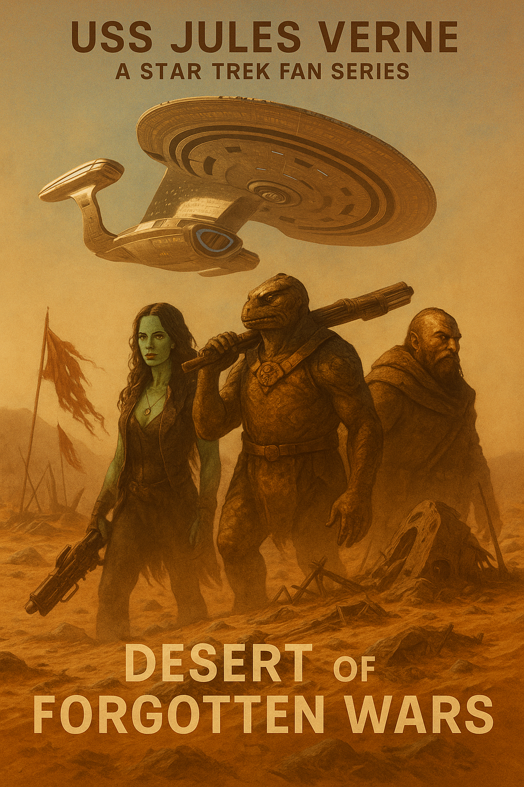 Minimalist ambient score with gritty, tribal percussion, 70 BPM, Uses dry frame drums, taiko, desert shakers, ambient pads, and bowed metal FX, No melody, only texture and pulse, Evokes the memory of ancient battles long buried in sand, Subtle tension, Inspired by sci-fi ruins and battlefield ghosts, Harsh, dry sound design with natural reverb, Star Trek TNG ambient tones