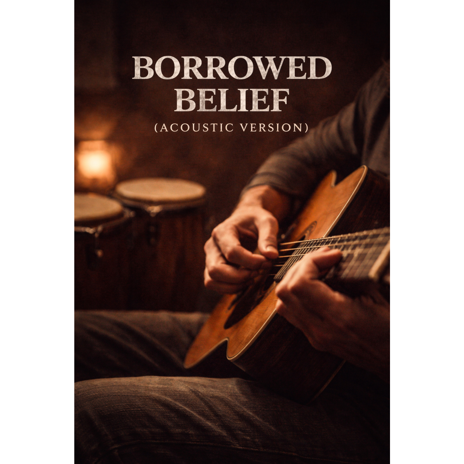 Acoustic Folk & Minimal Melodic Rap built around raw honesty, spiritual reflection, and human imperfection :: :: fingerpicked acoustic guitar, hand percussion (djembe, bongos, soft congas), natural room reverb, intimate vocal :: :: warm wood tones, candlelight shadows, unpolished air :: :: Studio Quality, Warm Analog Tube, Wide Stereo, Professional Mastering :: :: starts with solo acoustic guitar and close-mic vocal -> hand percussion enters subtly to add pulse -> drops to near-silence for the bridge with voice forward -> returns with fuller acoustic + percussion for final hook, ending naturally without resolution, ‑synths, ‑electronic drums, ‑heavy bass, ‑pop polish