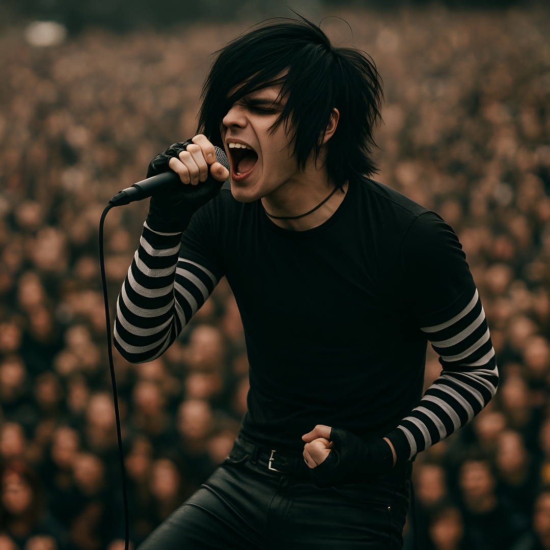 a blend of alternative rock, pop punk, and even elements of hip-hop and grime, He's known for his raw, energetic sound, Brit-pop, electronic elements, Male vocal in the style of, with a mix of punk energy, emotional grit, and pop-rock swagger, Gritty electric guitars, punchy drums, slight vocal distortion, Verses have a talk-sung delivery, choruses are big and anthemic with gang vocals, Genre: Alternative Pop Punk / Emo Rock, Mood: Sexy, Rebellious, Vulnerable, Chaotic Romance
