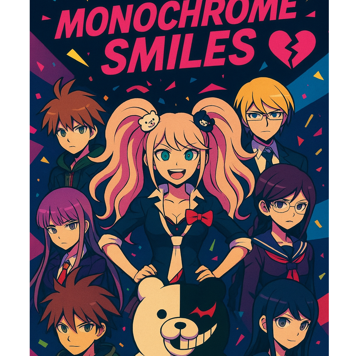 Upbeat J-pop × dark electro-pop × Danganronpa OST energy, Cute-but-creepy atmosphere with glitchy synths, distorted claps, and fast-paced percussion, Bright pop vocals mixed with tense, eerie undertones, Twisted cheerful melodies layered with unsettling harmonies, Occasional Japanese lines woven naturally into the lyrics, Energetic, stylish, dramatic, and chaotic — like an anime class-trial theme, Hints of 8-bit chiptune accents, stuttered vocal chops, and echoing effects, Overall feel: kawaii danger, hope vs despair, colorful darkness, high-tension pop