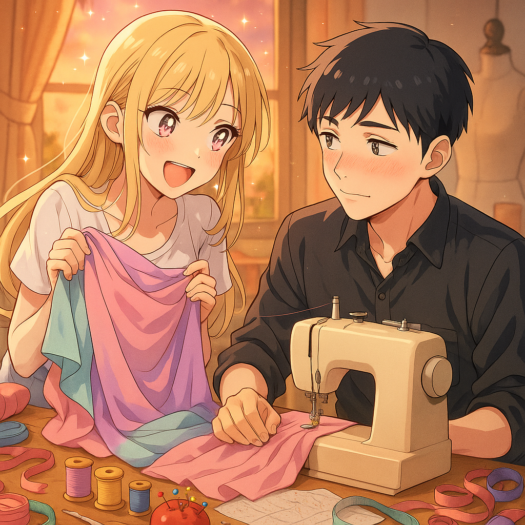 Anime-style, bright and playful pop-rock energy, cozy and colorful cosplay studio setting, K and B duet, flirty and teasing interaction, warm lighting with soft highlights, detailed fabric and sewing props (ribbons, pins, threads, patterns), vibrant but not overwhelming colors, expressive facial expressions with excitement and focus, slightly romantic undertones, dynamic composition with movement suggesting laughter and collaboration, soft but punchy electric guitars and drums in visual rhythm, upbeat and energetic mood, cinematic anime style, cozy and heartwarming atmosphere, cute and cheerful character designs, subtle soft glow and sparkles to accent playful energy