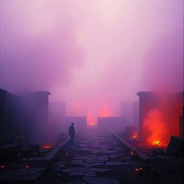 The song opens with slow, crushing doom metal guitar riffs layered under sweeping symphonic strings and towering brass, Drums shift abruptly from a measured march to bursts of blazing, double-kick-driven fast-paced beats, Massive reverbs envelop choral layers and lead guitars, building a dense, cinematic texture, The arrangement seamlessly interweaves grand orchestral passages with aggressive metal energy for maximum impact, s: atmospheric, heavy, progressive, with poetic and mythic imagery, I’ll craft it so it feels like wandering through the landscapes of the mind, lost in time, chasing clarity