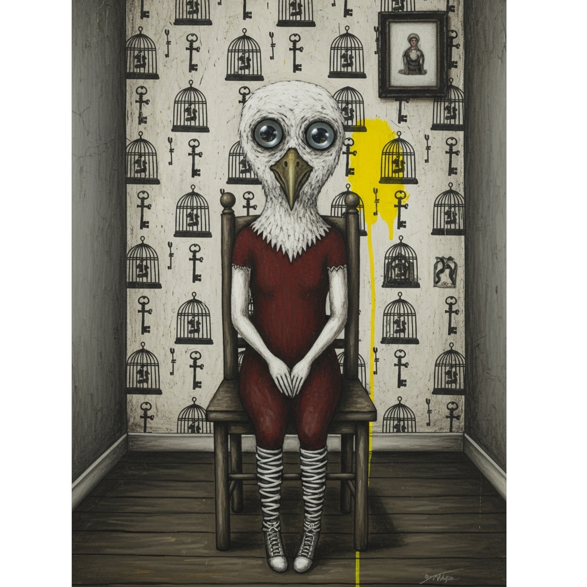 Art-folk meets post-punk with street theater aesthetics: detuned acoustic guitar, bone-rattle percussion, abrupt silences, and choir harmonies, Begins in plodding 6/8 D minor, fractures in bridge, resolves into skipping 7/8 F major, [Wren vocals: breathy, fibrillating, glottal fry, tremulous, slack-jawed, airy, feathery, fragile, lucid, matte, light, veiled, supple, conversational, childlike, playful, hushed, intimate, earnest, fragmented, lilting, deadpanned, aspirated], Male/female non-binary lead, ambient room tone, close-mic intimacy, DIY production, ‑humming intro, ‑hum, ‑vocalise, ‑humming, ‑intro