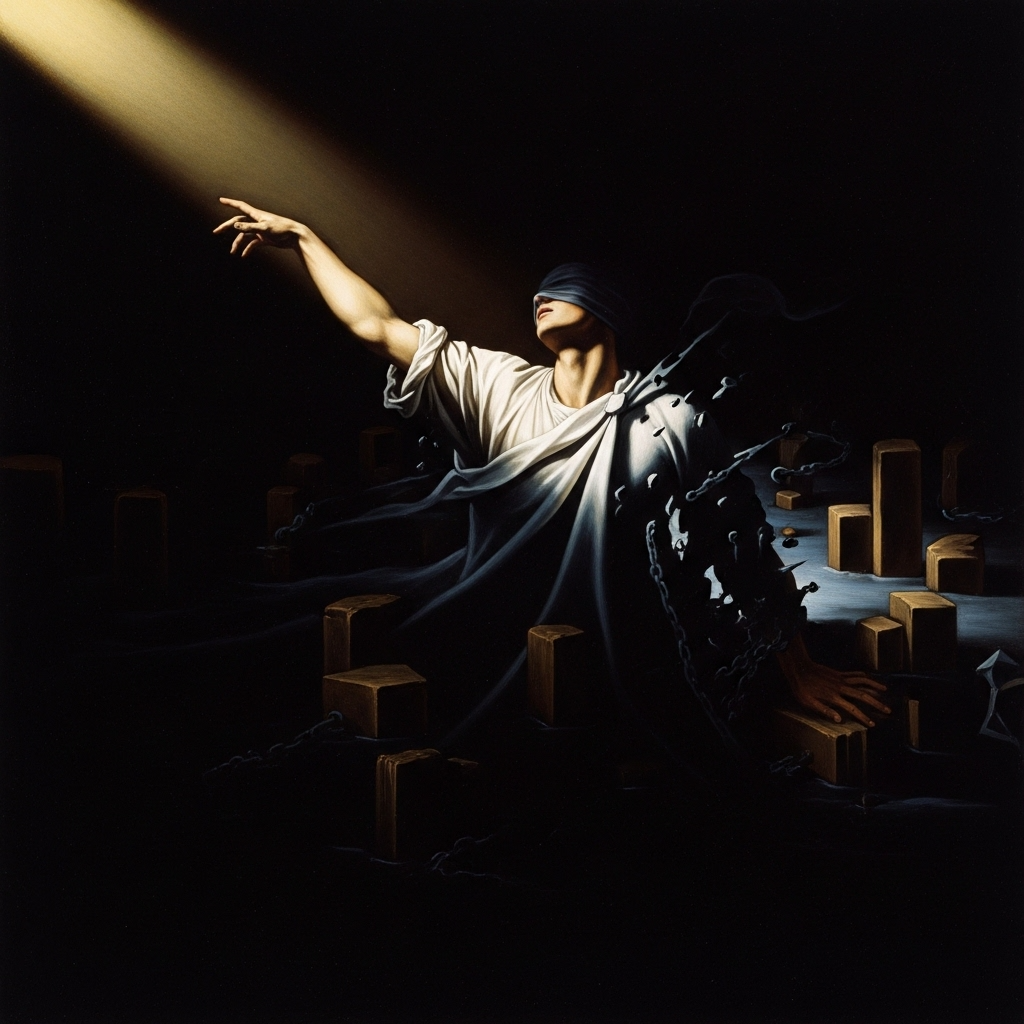 Intimate post-rock with chamber elements, fingerpicked acoustic guitar foundation building through layered strings and subtle percussion, Warm analog production, close-mic'd vocals creating conversational intimacy, Dynamic arc from sparse contemplation to orchestral revelation, then gentle resolution, Textured soundscape balancing organic instruments with modern spatial production techniques, Emotional build mirrors internal philosophical recognition, string arrangements providing harmonic depth without overwhelming the intimate vocal delivery