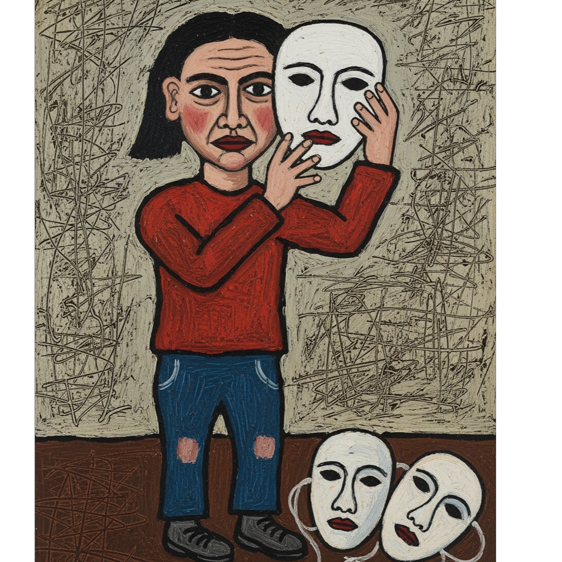 Alt pop and emo tinted school gym anthem with mid tempo groove, dry punchy drums, gritty bass, and lean guitar stabs, blending lo fi electronic edges with chant ready gang vocals from classmates, Verses stay sparse and intimate, built on muted chords, subtle keys, and close mic lead, while choruses swell with stomps, claps, and shouted hooks that feel like after hours drama club revolt, Bridge rises into a raw monologue over thinned arrangement, then explodes back into full band, [Rook vocals: husky, granular, warm yet bright edged, cracked on highs, youthful and resonant] delivering conversational, confessional lines that grow into anthemic belts, behind the beat at first then more driving, with syncopated phrasing and dynamic swells, Overall mix keeps strong midrange presence and tight low end for school hall energy, ‑humming intro, ‑hum, ‑vocalise, ‑humming, ‑intro