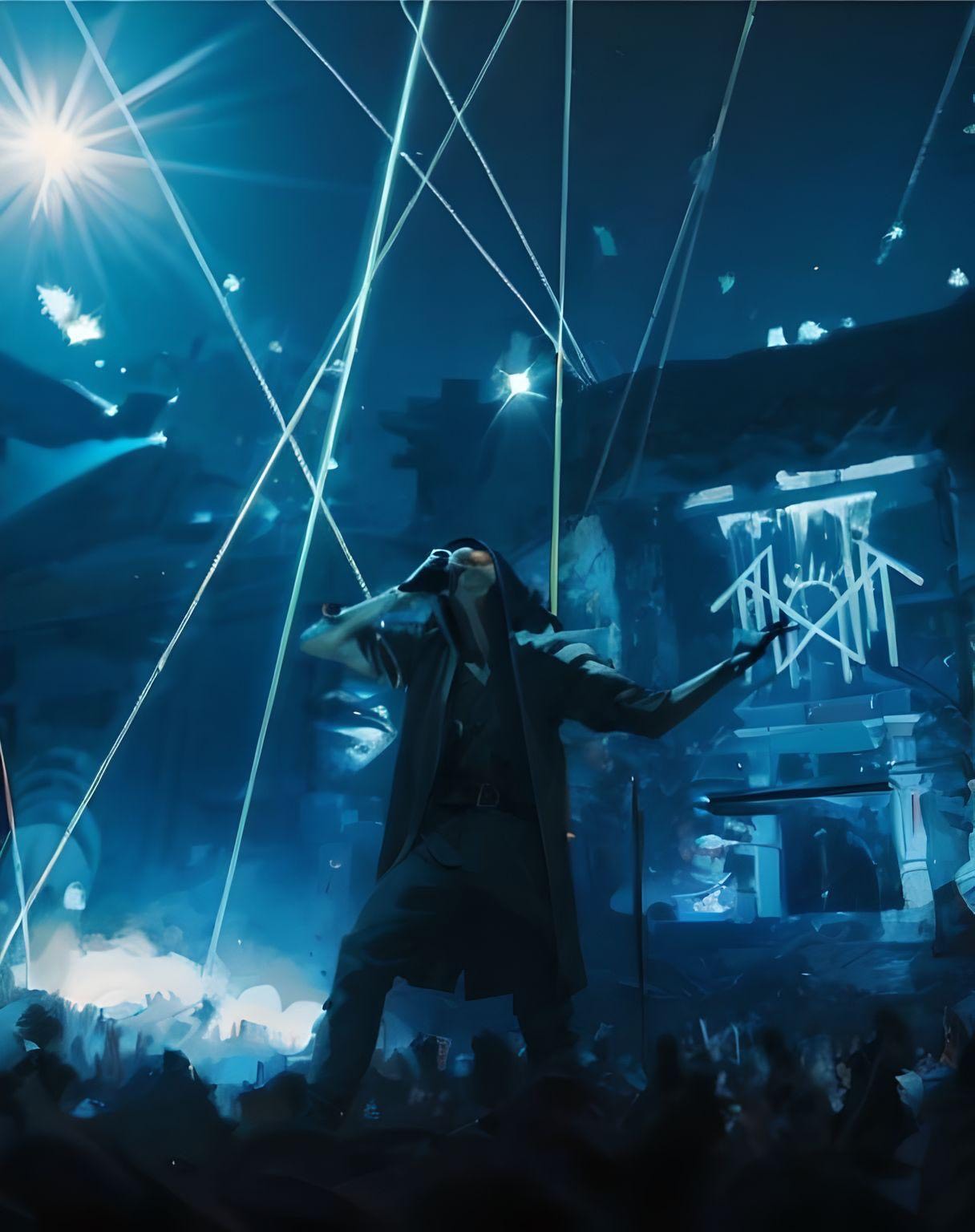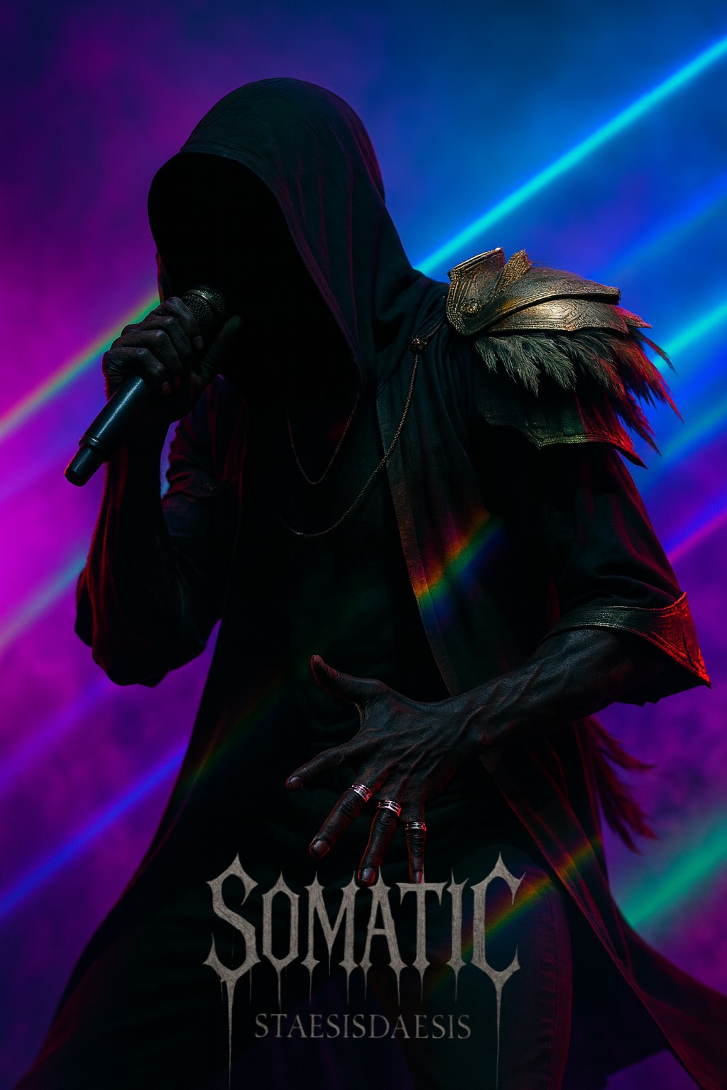 LIVE CONCERT PERFORMED BY Sleep Token WITH CHEERING & singing audience, Dark overtones, Dark-R&B, post-classical, indie, dark-punk, mid-tempo, low breathy baritone British male vocals sung close to the mic through clenched teeth for resonance, performed by Sleep Token (Leo Faulkner), soaring belts, long low unique seductive runs with full-body vibrato, synths & pads, piano, melodic sexy aggression, sarcastic lyricism, drums & rapid kick-drums, catchy hooks, venomous vocals, danceable decay, unique synths FX