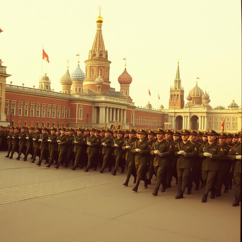 marching parade Russian military band, jumping taiko drum, epic ambient, glorious, Proud, power, 30% resonant/70% consonant-mix basslines, masive Militairy hard footsteps bounce, Low male voices hums