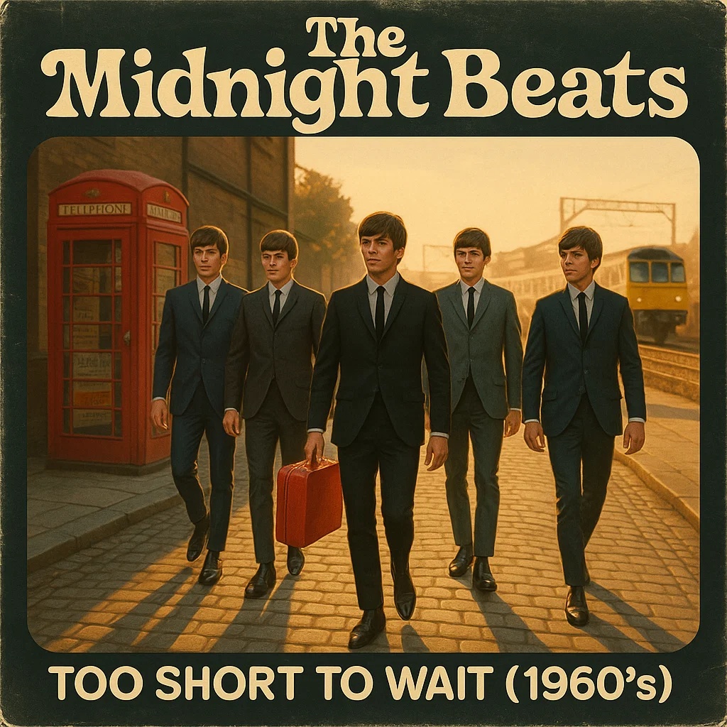 Modular 60s-inspired pop track with a structured fusion of eras, Male vocal with playful tone and vintage phrasing, [Intro] begins fully retro: surf guitar riff, tambourine, handclaps, mono drums, doo-wop backing vocals, [Verse 1] starts retro but introduces analog synth pad and groovy bass, [Pre-Chorus] builds with stereo claps, tape flutter FX, and melodic transitions, [Chorus] shifts into full modern synth-pop mode with bright Juno-style synths, stereo vocals, and modern drum layering, [Verse 2] returns to 60s aesthetic with classic rhythm section, filtered lo-fi touch, and live sax, [Bridge] fuses both eras with psychedelic textures, tape warble, arpeggiated synths, and wide vocal harmony, [Final Chorus] brings all elements together in a vibrant blend of retro and modern, Mixing balances vintage warmth with modern punch, Target -11 LUFS, Fun, dynamic, and sweetly nostalgic with a conceptual twist