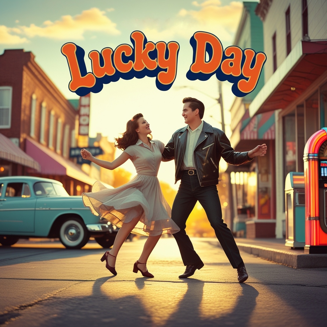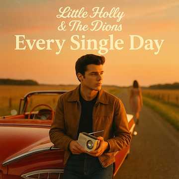 Late 1950s American rock and roll, Clean electric guitars (rhythmic strumming, short melodic solos), upright or electric bass, snappy drums, handclaps, Song structure: short intro, chorus first, two short verses, repeated catchy chorus, brief guitar solo, final chorus, short outro, Lead vocal with โvocal hiccupโ, simple harmonies, Lyrics in English: young love, romance, optimism, direct language, memorable hooks, Effects: room reverb, light tape saturation, Mood: bright, energetic, playful, nostalgic, danceable