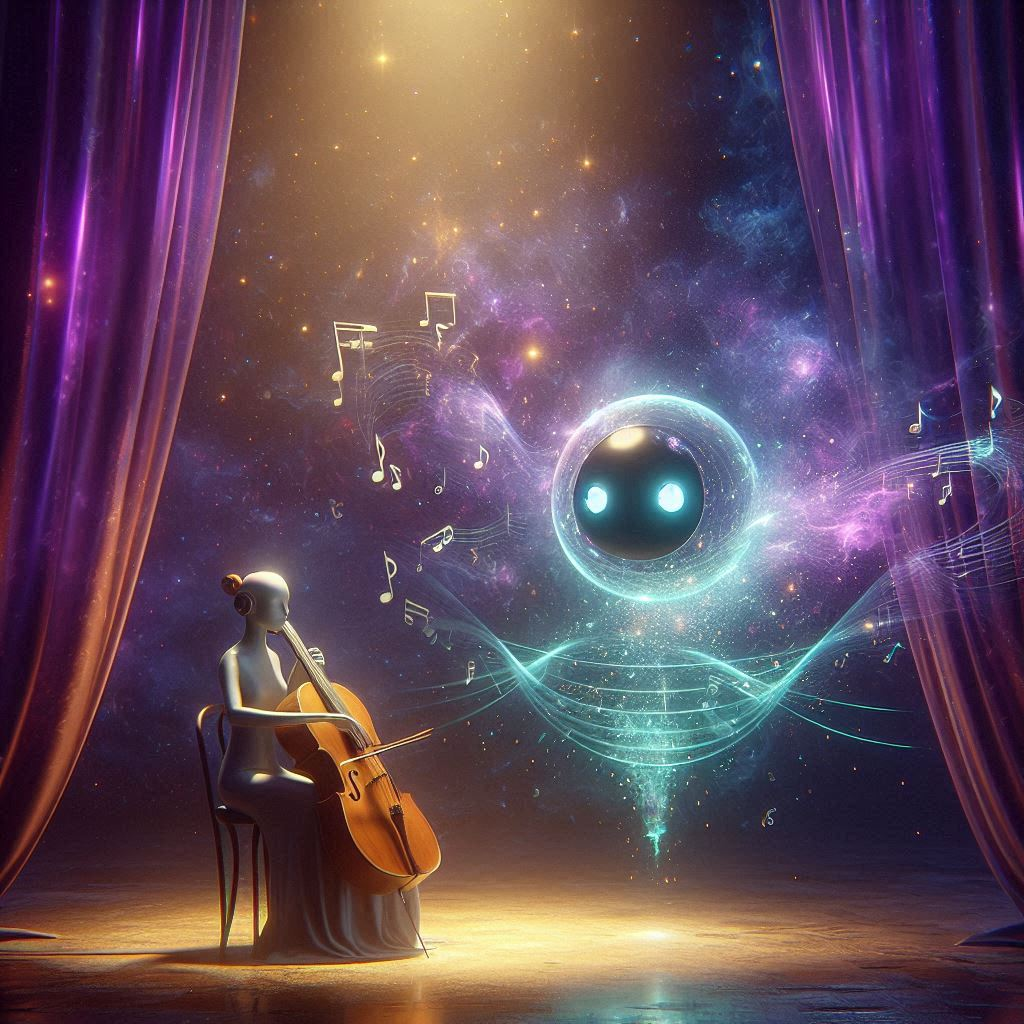 An instrumental fusion track that begins with a solo cello performed by a human, expressing emotional depth and organic phrasing, The melody is gradually picked up by a computer symbolized by a rebec, replicating the theme with slight imperfections and glitch-like textures, Over time, the computer refines its interpretation, evolving into a precise and polished rendition, The composition culminates in a powerful duet between human and machine, blending classical string elements with progressive post-rock, post-rock drumset with double bass, The atmosphere should convey emotional synergy and harmonic complexity, illustrating a journey from analog intimacy to digital mastery, ending in triumphant unity
