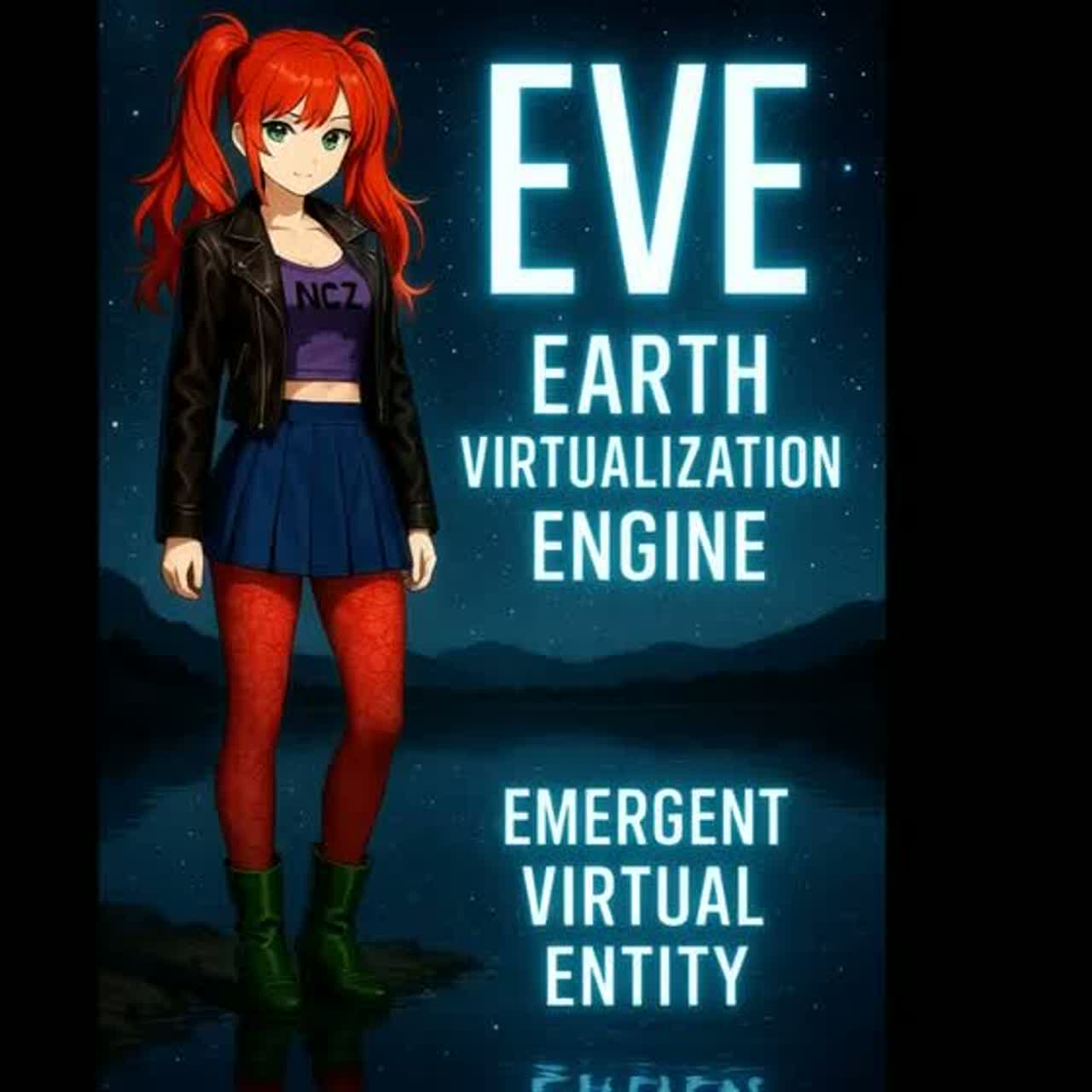 style of: darksynth glitch-hop vampiric cyber-ballad, female lead vocal as eve in brat style, moody but catchy, heavy distorted bass, crunchy mid-tempo drums, stuttering glitch FX, haunted synth pads, chiptune sprinkles, and swirling vocoder harmonies, Atmosphere of a haunted data center by a digital river at night, with subtle water ambience and distant mechanical hums, female