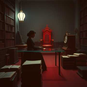 Ambient undertones: low synth hum, distant clockwork, turning pages, faint static