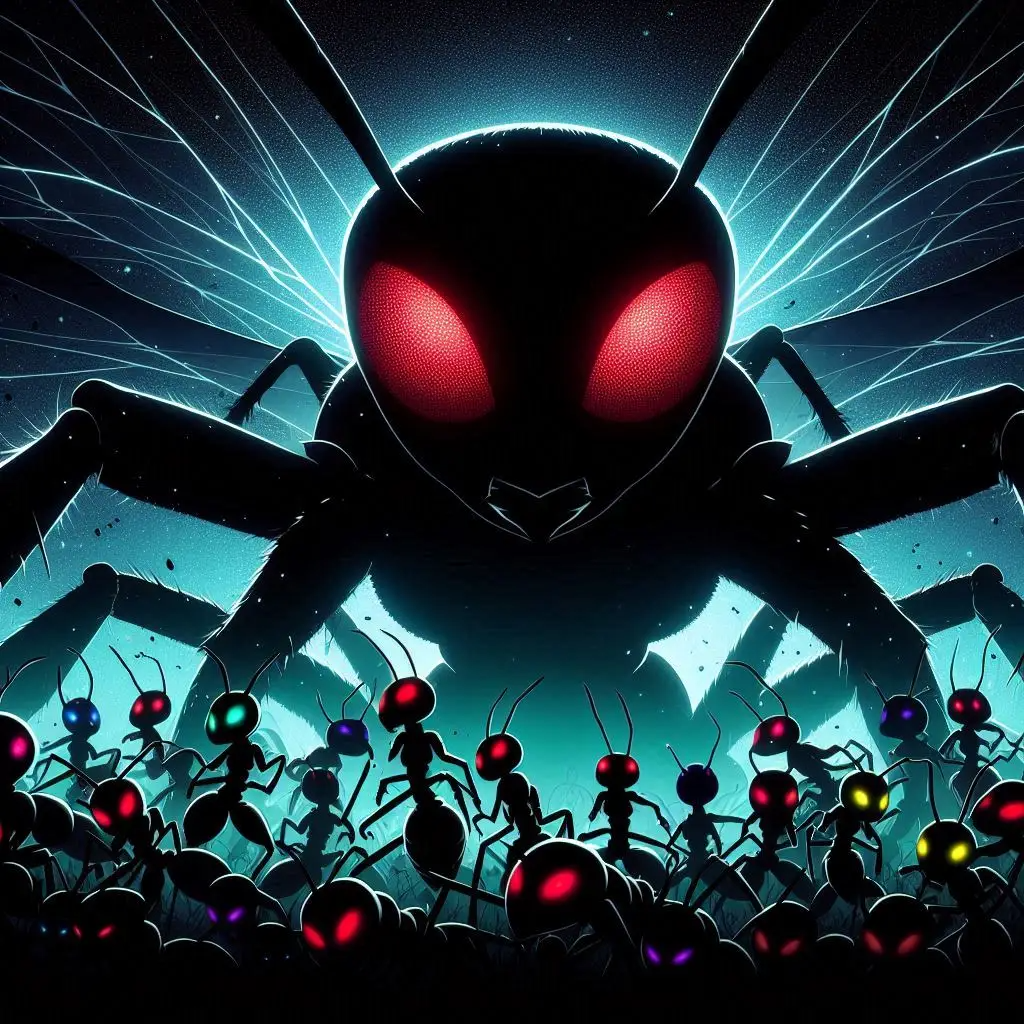 Dark instrumental boss fight music, brutal metal + horrorcore riffs, chiptune percussion like insect clicks, relentless gabber kicks (180โ200 BPM), eerie horror atmospheres with buzzing/clicking insect sounds, Aggressive, chaotic, apocalyptic