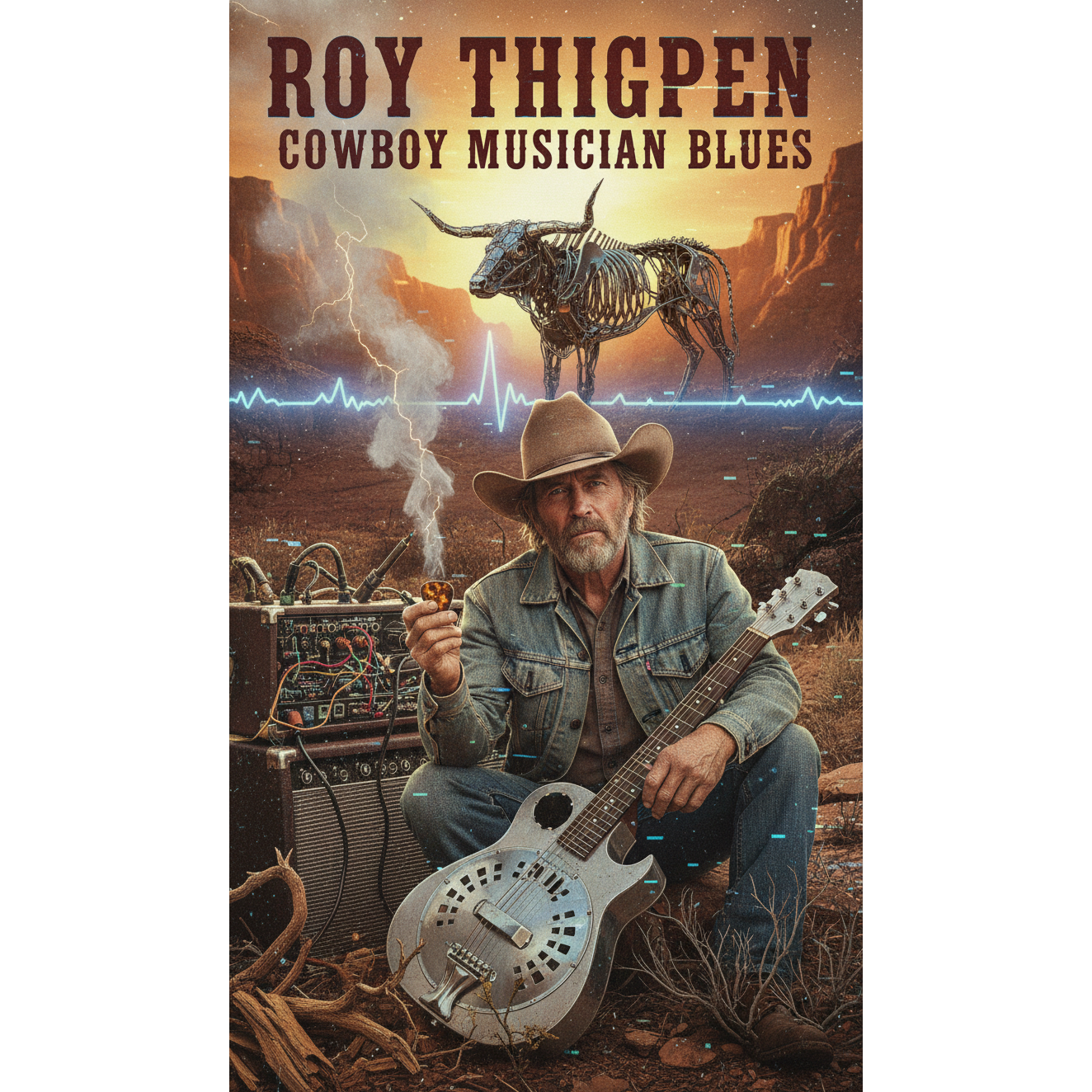 A gritty fusion of Delta Blues and Outlaw Country with lo-fi analog synth textures, Features raw, weathered male vocals, soulful slide guitar, and a dusty, mid-tempo stomp, Incorporates subtle electronic glitches, bit-crushed folk elements, and a desolate desert atmosphere, Instrumentation includes acoustic resonator guitar, harmonica, and warm oscillator drones