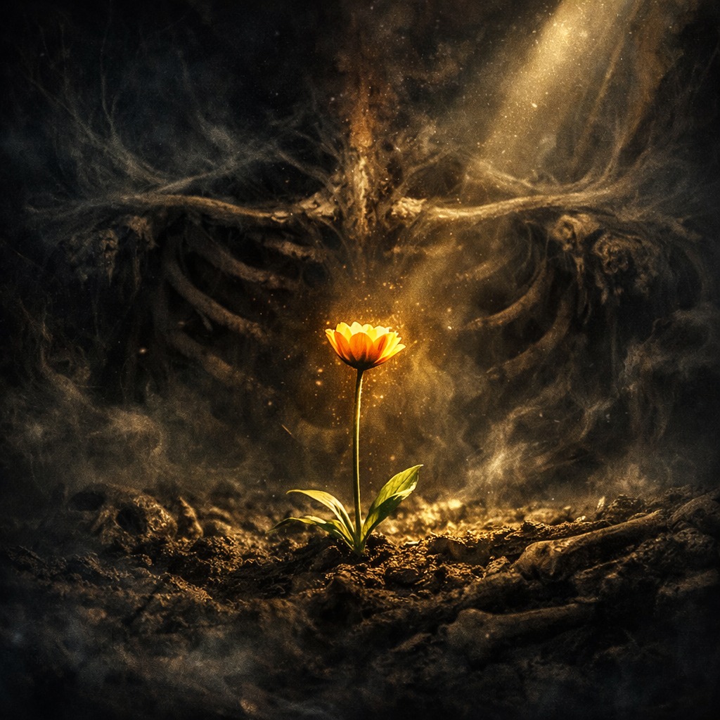 Ultra-violent Cinematic Deathcore × Melodic Electronicore × Industrial Glitchcore × DnB, 190 BPM, Vocal focus: relentless guttural growls + shriek layers, rapid-fire patterns, stacked octaves for sheer impact, Riffs: downtuned chugs, pinch-squeal stabs, brutal stops, slam hits; drums: blast-run bursts, machine-gun kicks, half-time breakdowns, Still melodic: cathedral choir pads, minor-key supersaw hooks, string/organ lifts, haunting lead motif that returns each chorus, Glitch: stutter edits, bitcrush snarls, tape-stops, granular impacts, sudden silence voids, Arc: cold intro → escalating verse → monstrous chorus → rupture bridge → final chorus, hard cut