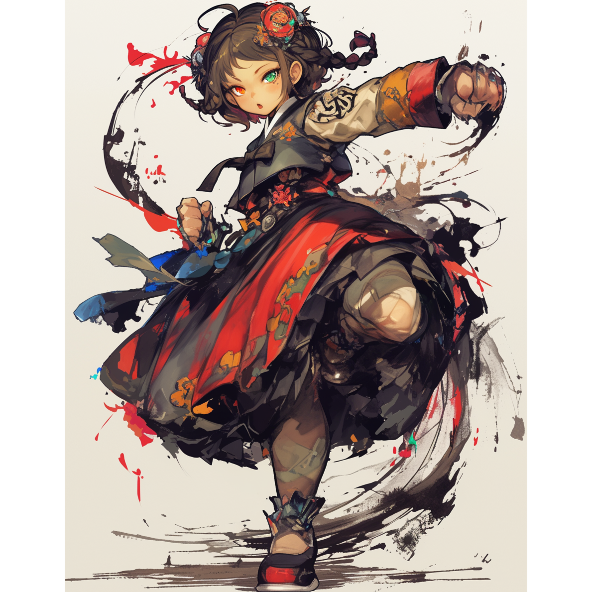 [Instrument: Korean traditional percussion ensemble (rumbling barrel drums (Buk), syncopated hourglass-shaped drums (Janggu), sharp crash cymbals), sharp plucked zither (Gayageum) glissandos and arpeggios like sword sounds, no melodic instruments in the western sense]