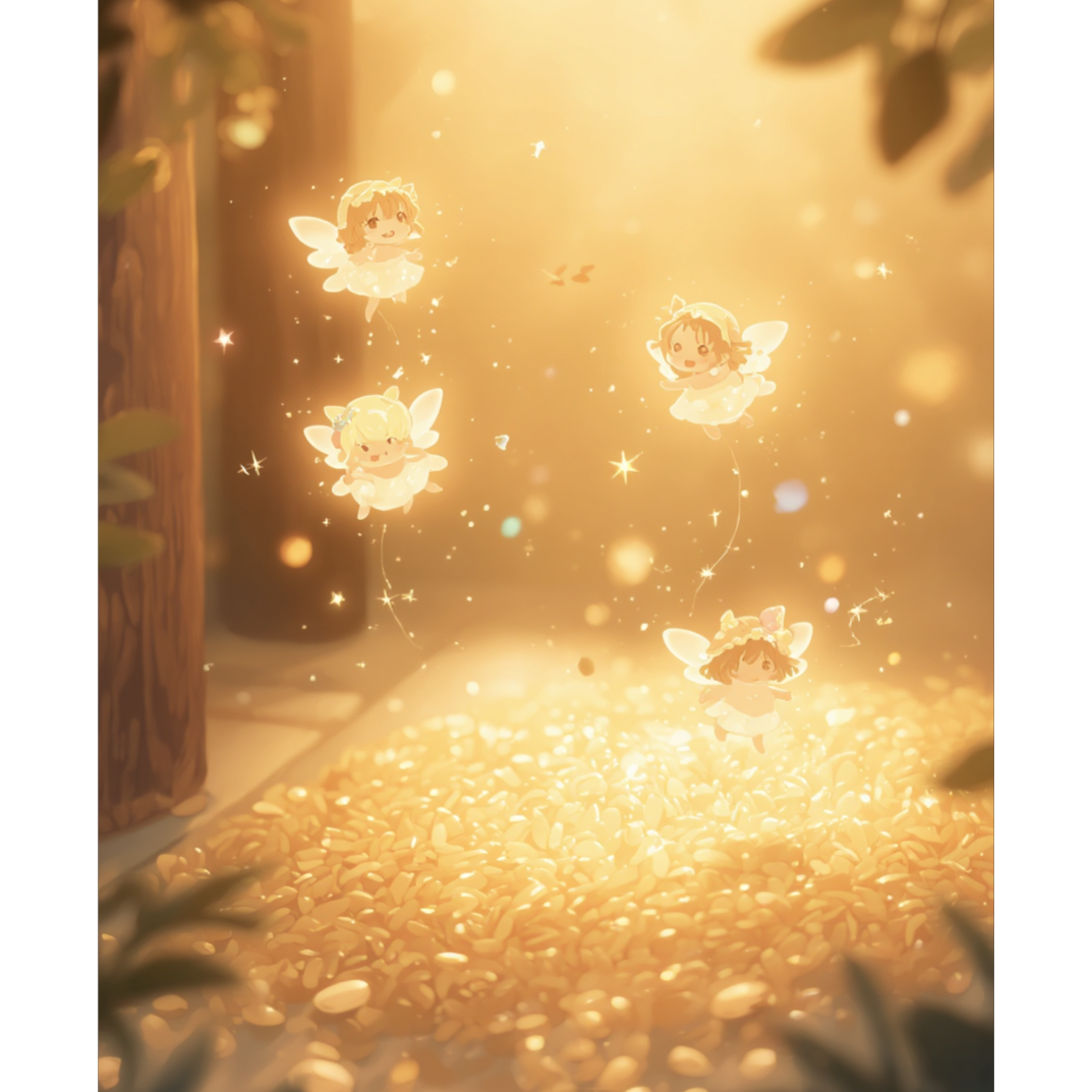 Create a whimsical, magical, and cute fantasy soundtrack, suitable for a children's picture book, Instruments: soft bells, glockenspiel, gentle piano, warm string pads, light harp, airy synths, Mood: enchanting, heartwarming, sparkling, dreamy, with a sense of tiny magical spirits at work, Rhythm: gentle, flowing, mid-tempo, with subtle playful arpeggios and twinkling melodic motifs, Include: soft chimes and subtle magical sound effects, like sparkling dust or tiny wings fluttering, Atmosphere: cozy, charming, storybook-like, as if tiny magical creatures are awakening grains of rice and beans with golden light, Structure: clear intro, gentle build-up, uplifting chorus-like section, soft outro fading into sparkling magic, Vibe: joyful, nurturing, whimsical, innocent, slightly cinematic but very light and playful, No vocals, fully instrumental, with emphasis on magical and cute textures