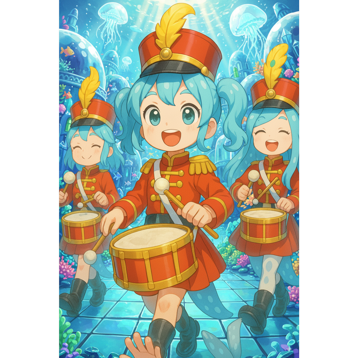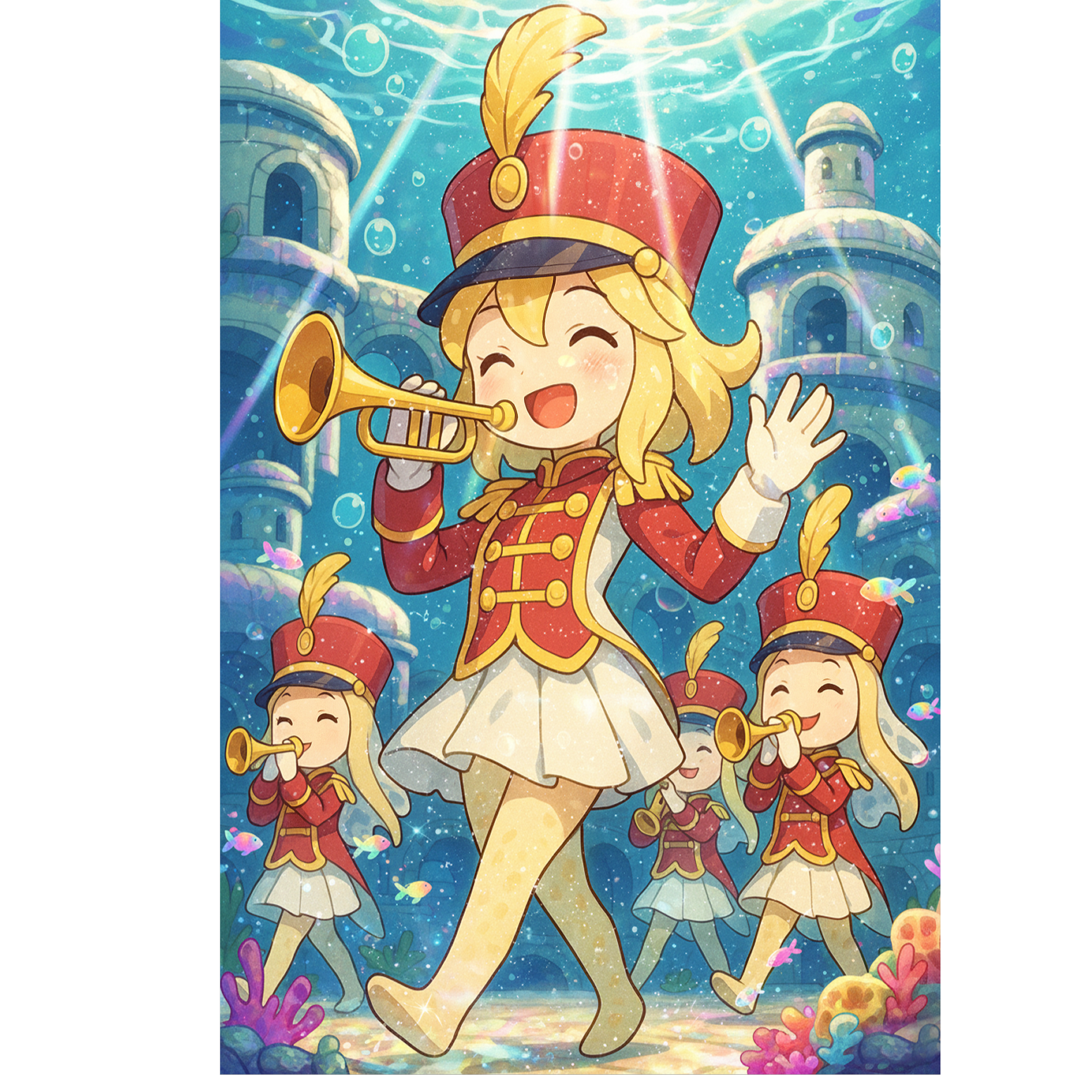 style: Bright Japanese fantasy parade march, joyful and cinematic